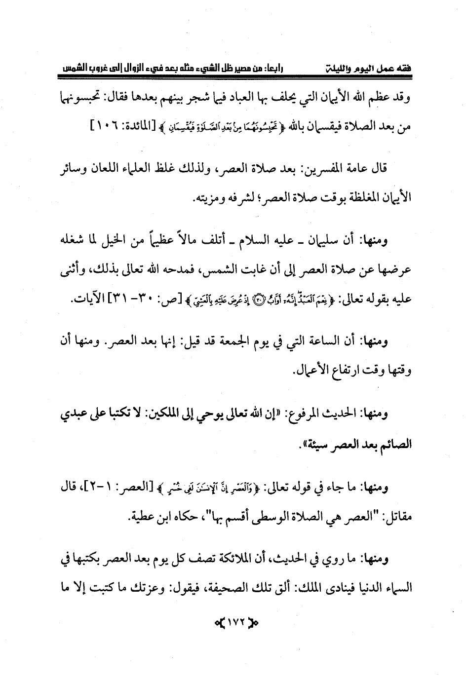 ومنها: ما جاء في قوله تعالى: {وَالْعَصْرِ إِنَّ الْإِنْسَانَ لَفِي خُسْرٍ} [العصر: 1 - 2]، قال مقاتل: "العصر هي الصلاة الوسطى أقسم بها"، حكاه ابن عطية.