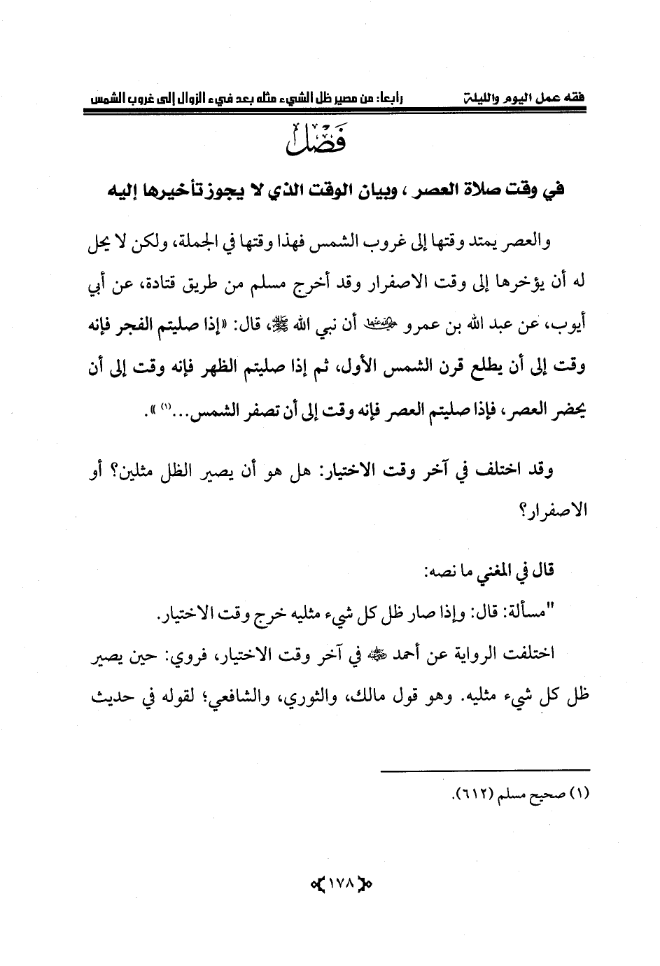 والعصر يمتد وقتها إلى غروب الشمس فهذا وقتها في الجملة، ولكن لا يحل له أن يؤخرها إلى وقت الاصفرار وقد أخرج مسلم من طريق قتادة، عن أبي أيوب، عن عبد الله بن عمرو - رضي الله عنهما - أن نبي الله - صلى الله عليه وسلم -، قال: «إذا صليتم الفجر فإنه وقت إلى أن يطلع قرن الشمس الأول، ثم إذا صليتم الظهر فإنه وقت إلى أن يحضر العصر، فإذا صليتم العصر فإنه وقت إلى أن تصفر الشمس ...» (¬1).
