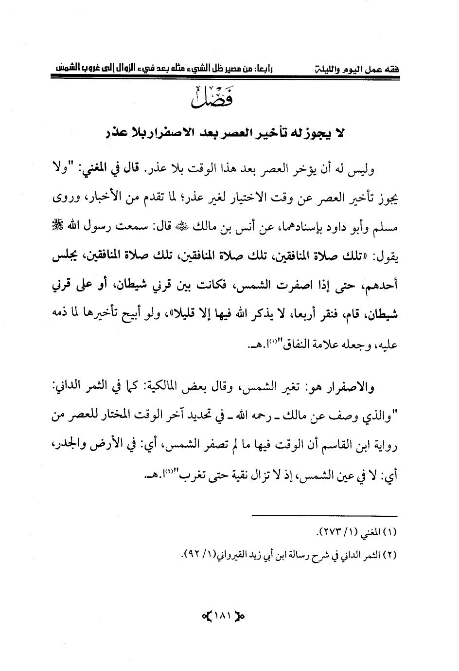 وليس له أن يؤخر العصر بعد هذا الوقت بلا عذر. قال في المغني: "ولا يجوز تأخير العصر عن وقت الاختيار لغير عذر؛ لما تقدم من الأخبار، وروى مسلم وأبو داود بإسنادهما، عن أنس بن مالك - رضي الله عنه - قال: سمعت رسول الله - صلى الله عليه وسلم - يقول: «تلك صلاة المنافقين، تلك صلاة المنافقين، تلك صلاة المنافقين، يجلس أحدهم، حتى إذا اصفرت الشمس، فكانت بين قرني شيطان، أو على قرني شيطان، قام، فنقر أربعا، لا يذكر الله فيها إلا قليلا»، ولو أبيح تأخيرها لما ذمه عليه، وجعله علامة النفاق" (¬1) ا. هـ.