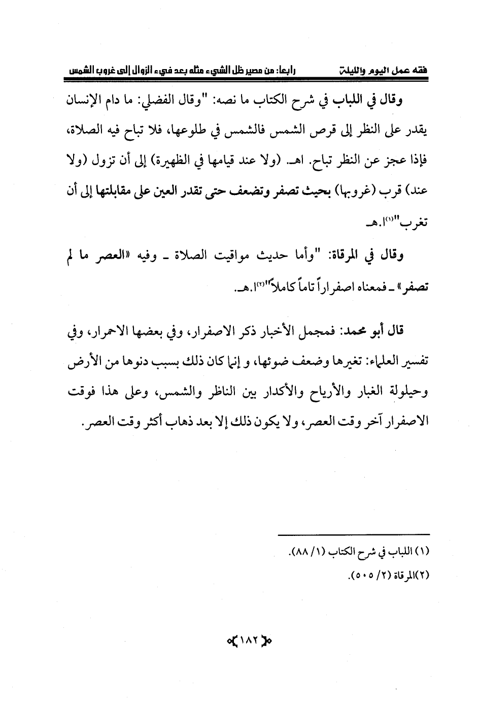 وقال في اللباب في شرح الكتاب ما نصه: "وقال الفضلي: ما دام الإنسان يقدر على النظر إلى قرص الشمس فالشمس في طلوعها، فلا تباح فيه الصلاة، فإذا عجز عن النظر تباح. اهـ. (ولا عند قيامها في الظهيرة) إلى أن تزول (ولا عند) قرب (غروبها) بحيث تصفر وتضعف حتى تقدر العين على مقابلتها إلى أن تغرب" (¬1) ا. هـ