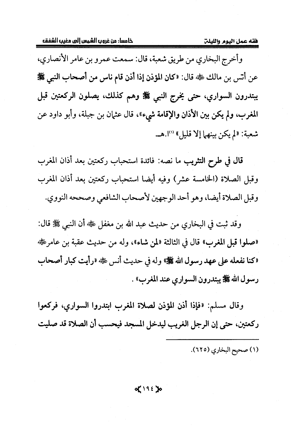 وقد ثبت في البخاري من حديث عبد الله بن مغفل - رضي الله عنه - أن النبي - صلى الله عليه وسلم - قال: «صلوا قبل المغرب» قال في الثالثة «لمن شاء»، وله من حديث عقبة بن عامر - رضي الله عنه - «كنا نفعله على عهد رسول الله - صلى الله عليه وسلم -» وله في حديث أنس - رضي الله عنه - «رأيت كبار أصحاب رسول الله - صلى الله عليه وسلم - يبتدرون السواري عند المغرب».