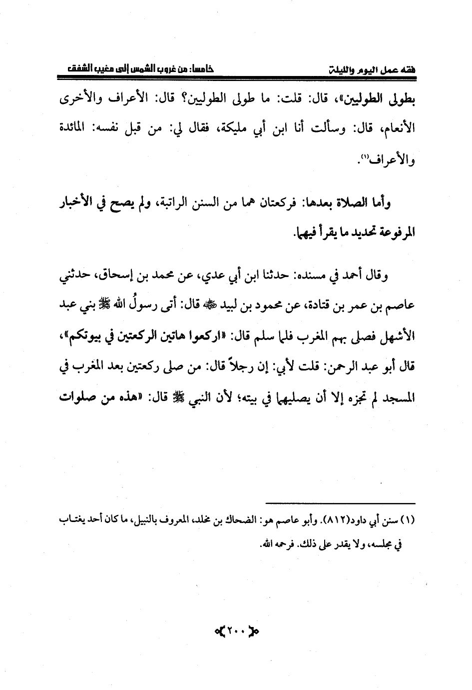 وقال أحمد في مسنده: حدثنا ابن أبي عدي، عن محمد بن إسحاق، حدثني عاصم بن عمر بن قتادة، عن محمود بن لبيد - رضي الله عنه - قال: أتى رسولُ الله - صلى الله عليه وسلم - بني عبد الأشهل فصلى بهم المغرب فلما سلم قال: «اركعوا هاتين الركعتين في بيوتكم»، قال أبو عبد الرحمن: قلت لأبي: إن رجلاً قال: من صلى ركعتين بعد المغرب في المسجد لم تجزه إلا أن يصليهما في بيته؛ لأن النبي - صلى الله عليه وسلم - قال: «هذه من صلوات