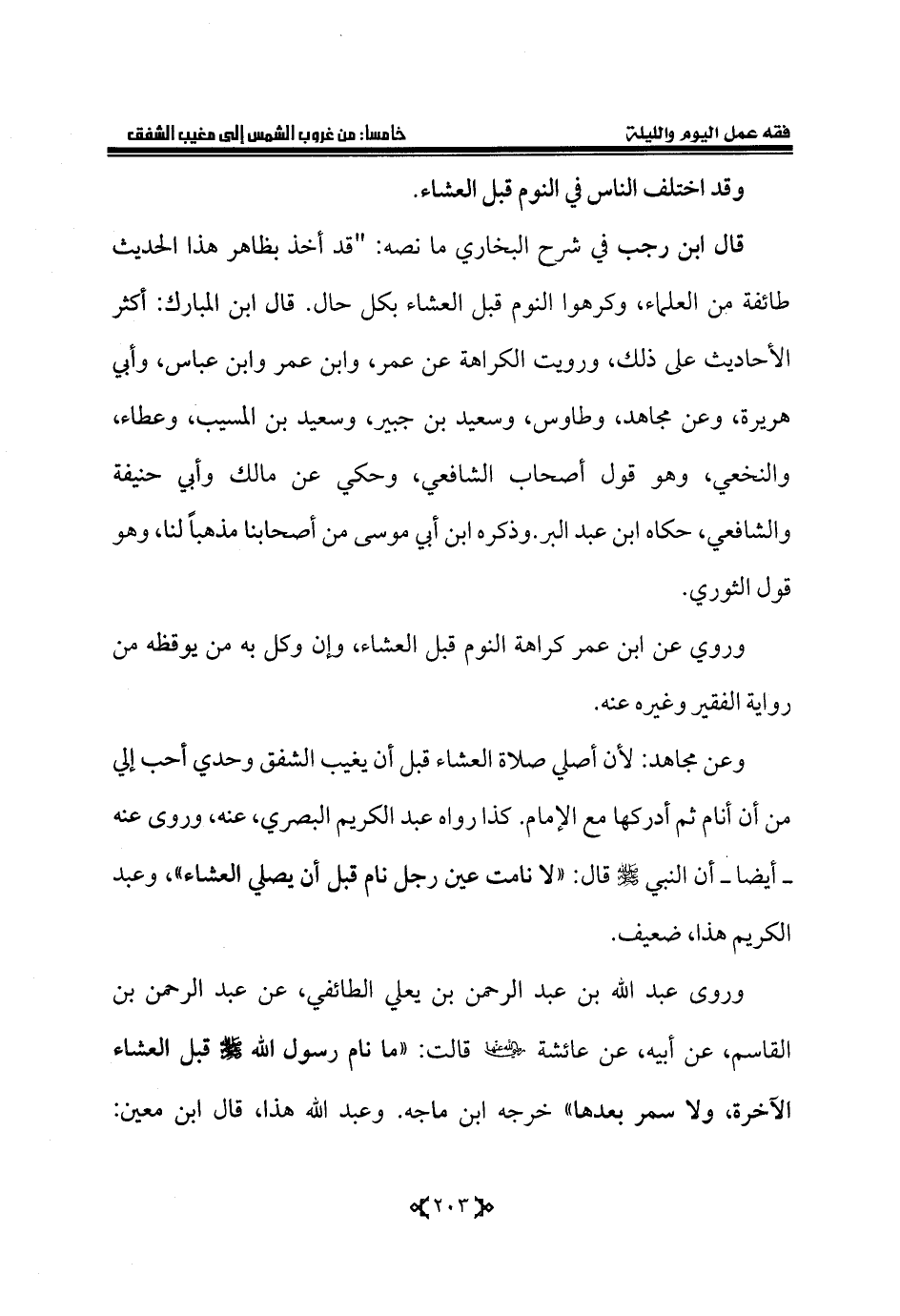 وروى عبد الله بن عبد الرحمن بن يعلي الطائفي، عن عبد الرحمن بن القاسم، عن أبيه، عن عائشة - رضي الله عنها - قالت: «ما نام رسول الله - صلى الله عليه وسلم - قبل العشاء الآخرة، ولا سمر بعدها «خرجه ابن ماجه. وعبد الله هذا، قال ابن معين: