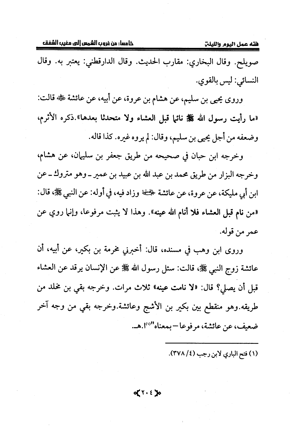 وروى يحيى بن سليم، عن هشام بن عروة، عن أبيه، عن عائشة - رضي الله عنه - قالت: «ما رأيت رسول الله - صلى الله عليه وسلم - نائما قبل العشاء ولا متحدثا بعدها».ذكره الأثرم، وضعفه من أجل يحيى بن سليم، وقال: لم يروه غيره. كذا قاله.