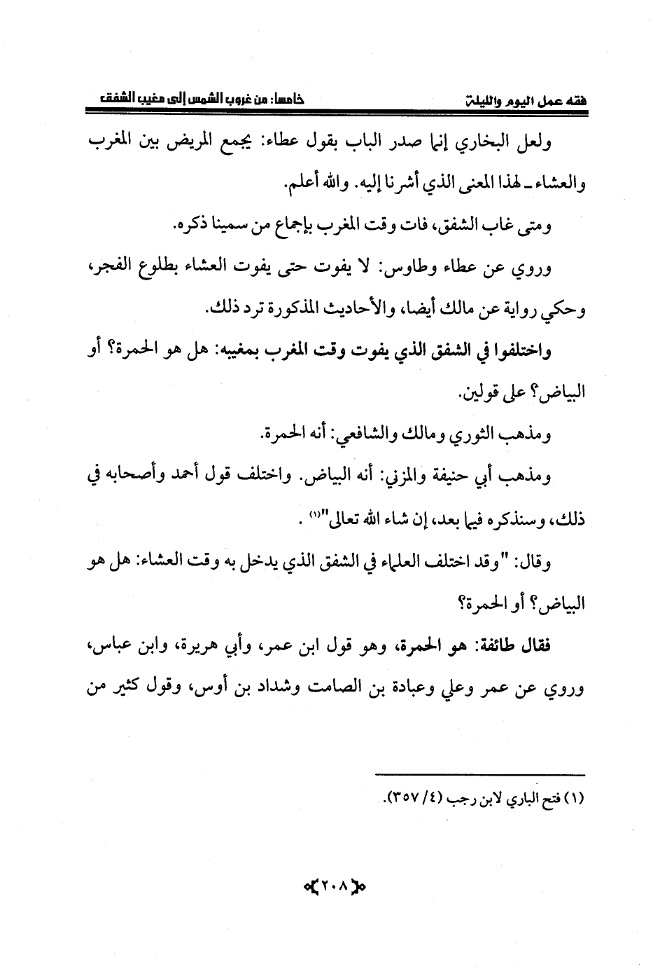وقال: "وقد اختلف العلماء في الشفق الذي يدخل به وقت العشاء: هل هو البياض؟ أو الحمرة؟
