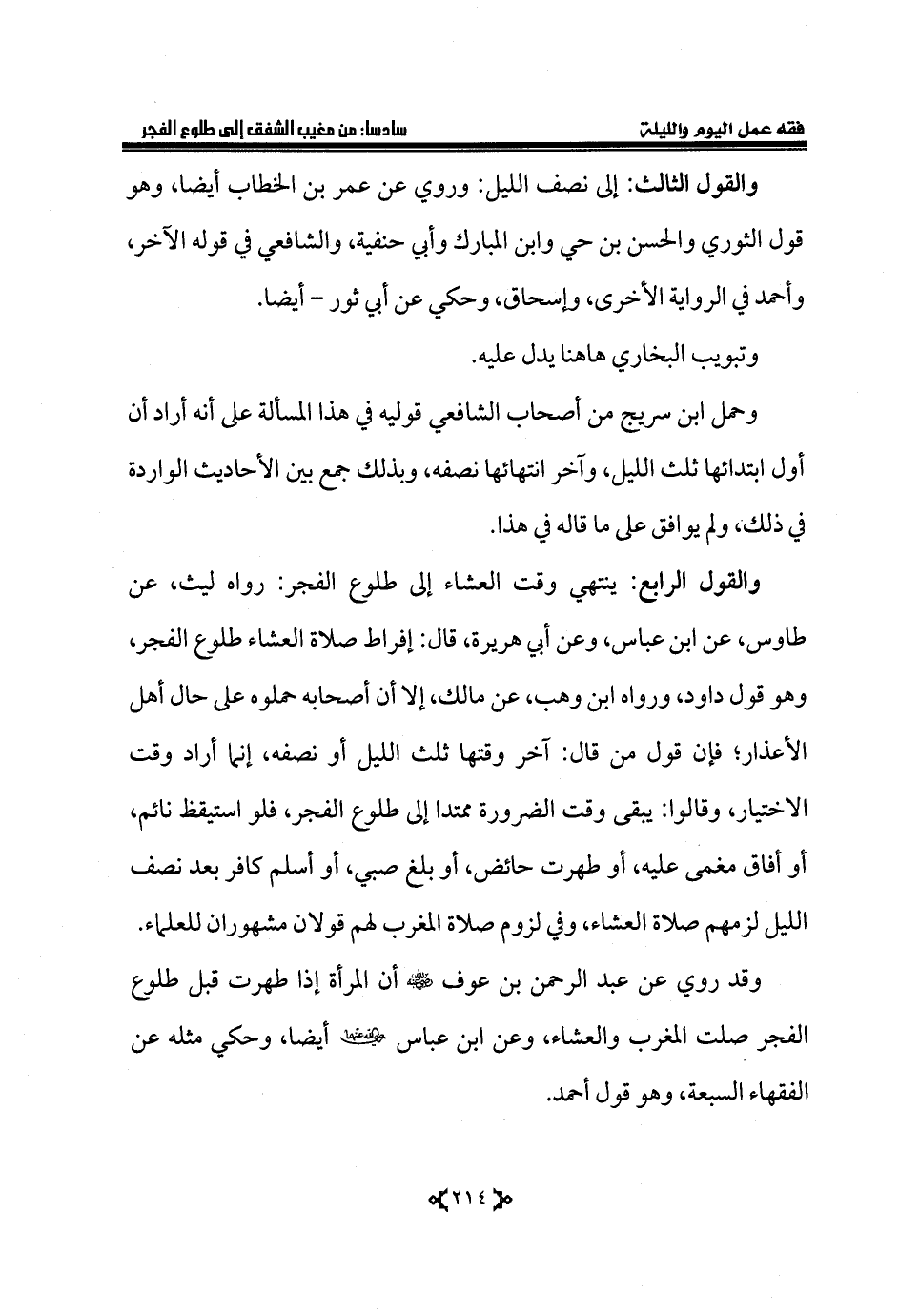 والقول الثالث: إلى نصف الليل: وروي عن عمر بن الخطاب أيضا، وهو قول الثوري والحسن بن حي وابن المبارك وأبي حنفية، والشافعي في قوله الآخر، وأحمد في الرواية الأخرى، وإسحاق، وحكي عن أبي ثور - أيضا.