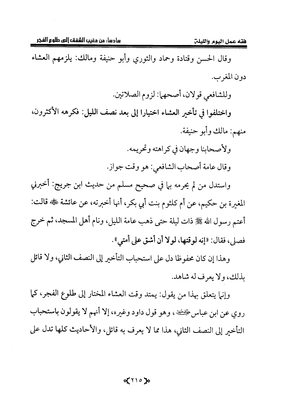 واختلفوا في تأخير العشاء اختيارا إلى بعد نصف الليل: فكرهه الأكثرون، منهم: مالك وأبو حنيفة.