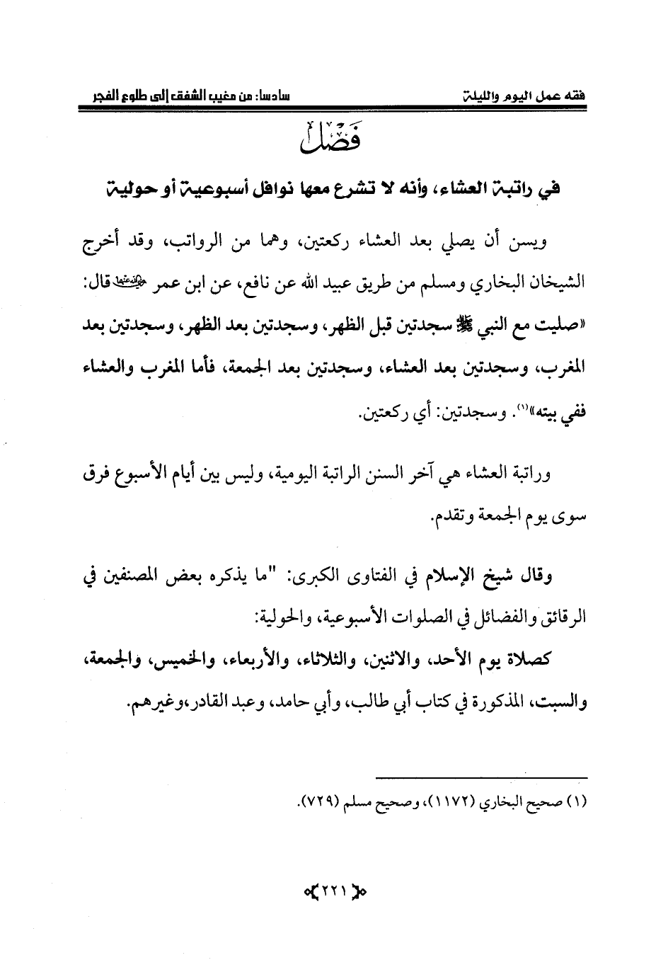 في راتبة العشاء، وأنه لا تشرع معها نوافل أسبوعية أو حولية