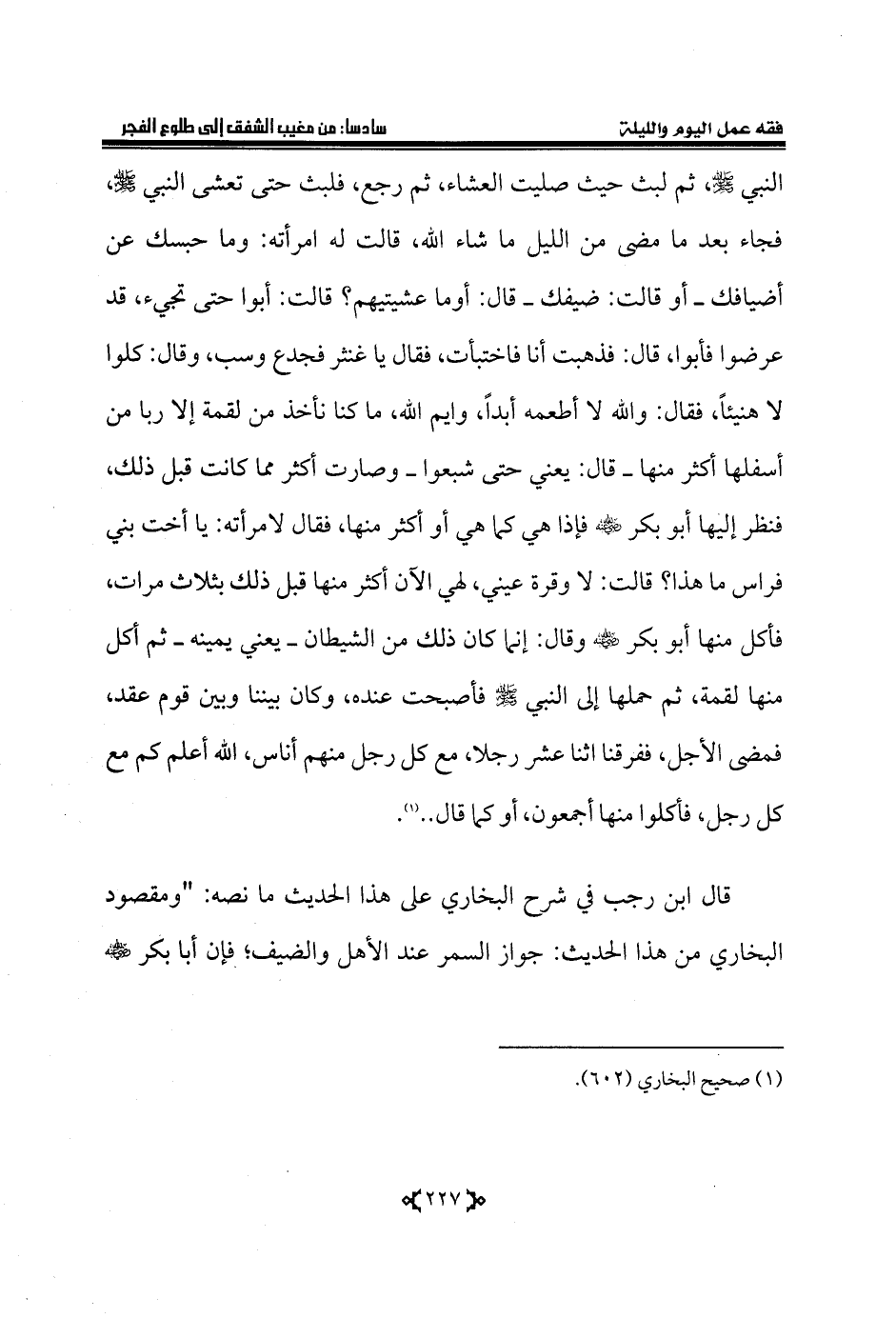 قال ابن رجب في شرح البخاري على هذا الحديث ما نصه: "ومقصود البخاري من هذا الحديث: جواز السمر عند الأهل والضيف؛ فإن أبا بكر - رضي الله عنه -