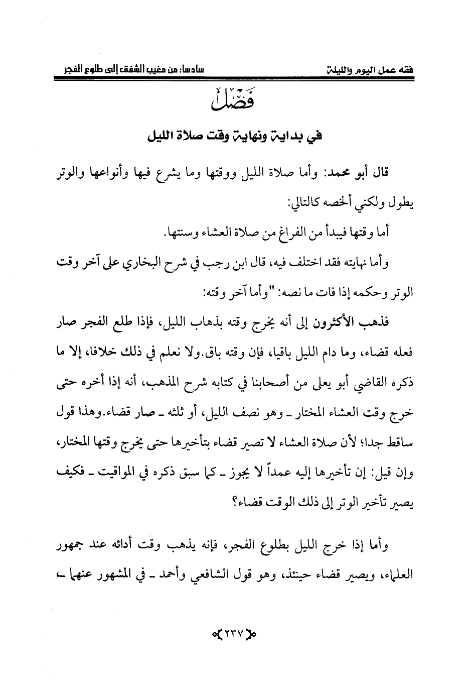 قال أبو محمد: وأما صلاة الليل ووقتها وما يشرع فيها وأنواعها والوتر يطول ولكني ألخصه كالتالي: