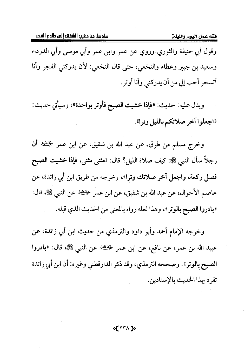 وخرجه الإمام أحمد وأبو داود والترمذي من حديث ابن أبي زائدة، عن عبيد الله بن عمر، عن نافع، عن ابن عمر - رضي الله عنهما - عن النبي - صلى الله عليه وسلم -، قال: «بادروا الصبح بالوتر». وصححه الترمذي، وقد ذكر الدارقطني وغيره: أن ابن أبي زائدة تفرد بهذا الحديث بالإسنادين.