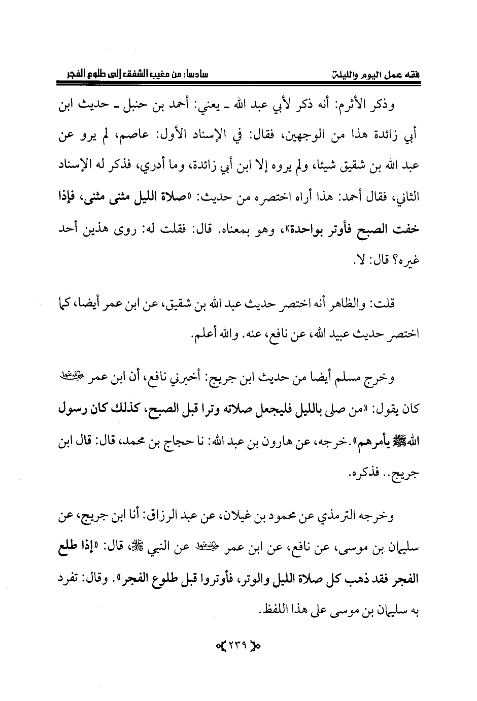 وخرجه الترمذي عن محمود بن غيلان، عن عبد الرزاق: أنا ابن جريج، عن سليمان بن موسى، عن نافع، عن ابن عمر - رضي الله عنهما - عن النبي - صلى الله عليه وسلم -، قال: «إذا طلع الفجر فقد ذهب كل صلاة الليل والوتر، فأوتروا قبل طلوع الفجر». وقال: تفرد به سليمان بن موسى على هذا اللفظ.