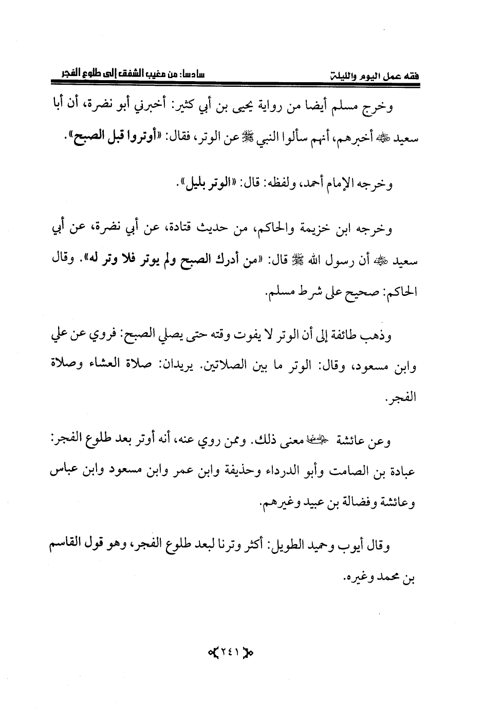 وخرج مسلم أيضا من رواية يحيى بن أبي كثير: أخبرني أبو نضرة، أن أبا سعيد - رضي الله عنه - أخبرهم، أنهم سألوا النبي - صلى الله عليه وسلم - عن الوتر، فقال: «أوتروا قبل الصبح».