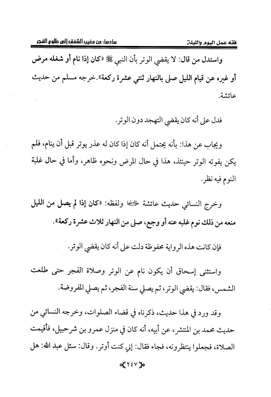 وخرج النسائي حديث عائشة - رضي الله عنها - ولفظه: «كان إذا لم يصل من الليل منعه من ذلك نوم غلبه عنه أو وجع، صلى من النهار ثلاث عشرة ركعة».