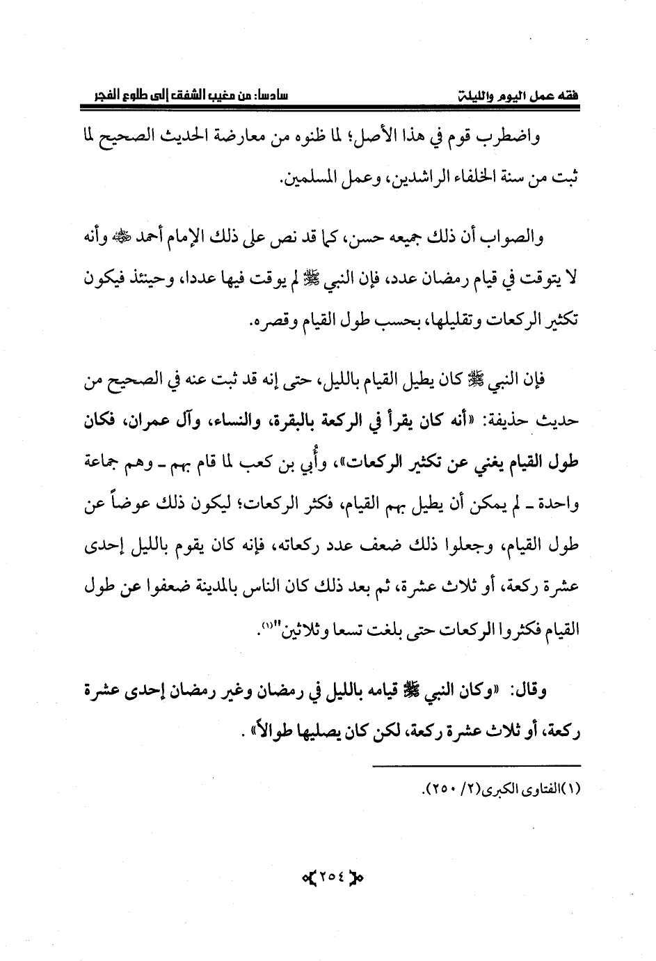 والصواب أن ذلك جميعه حسن، كما قد نص على ذلك الإمام أحمد - رضي الله عنه - وأنه لا يتوقت في قيام رمضان عدد، فإن النبي - صلى الله عليه وسلم - لم يوقت فيها عددا، وحينئذ فيكون تكثير الركعات وتقليلها، بحسب طول القيام وقصره.