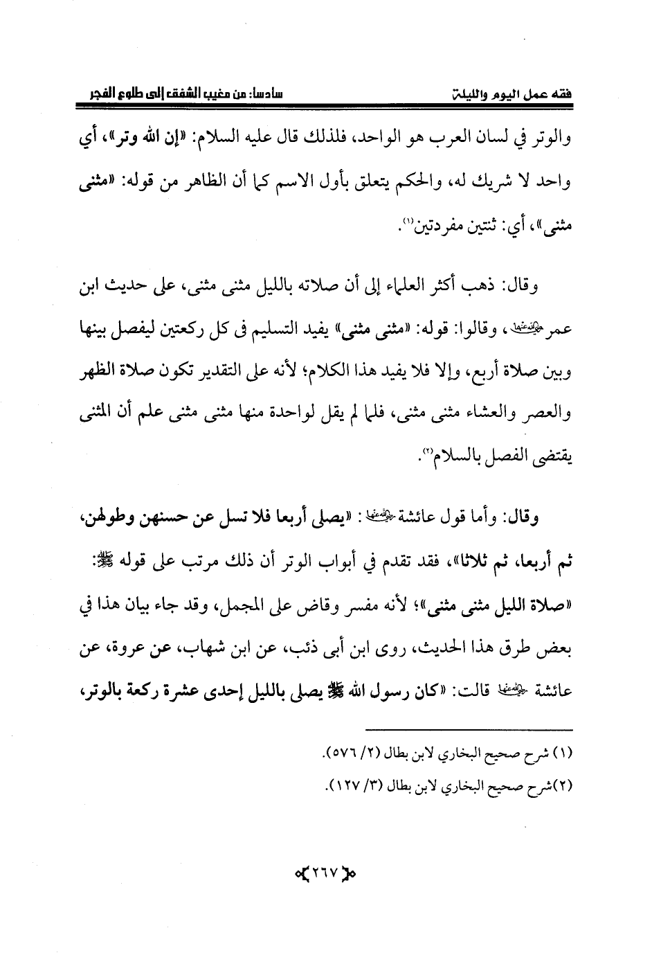 وقال: ذهب أكثر العلماء إلى أن صلاته بالليل مثنى مثنى، على حديث ابن عمر - رضي الله عنهما -، وقالوا: قوله: «مثنى مثنى «يفيد التسليم فى كل ركعتين ليفصل بينها وبين صلاة أربع، وإلا فلا يفيد هذا الكلام؛ لأنه على التقدير تكون صلاة الظهر والعصر والعشاء مثنى مثنى، فلما لم يقل لواحدة منها مثنى مثنى علم أن المثنى يقتضى الفصل بالسلام (¬2).