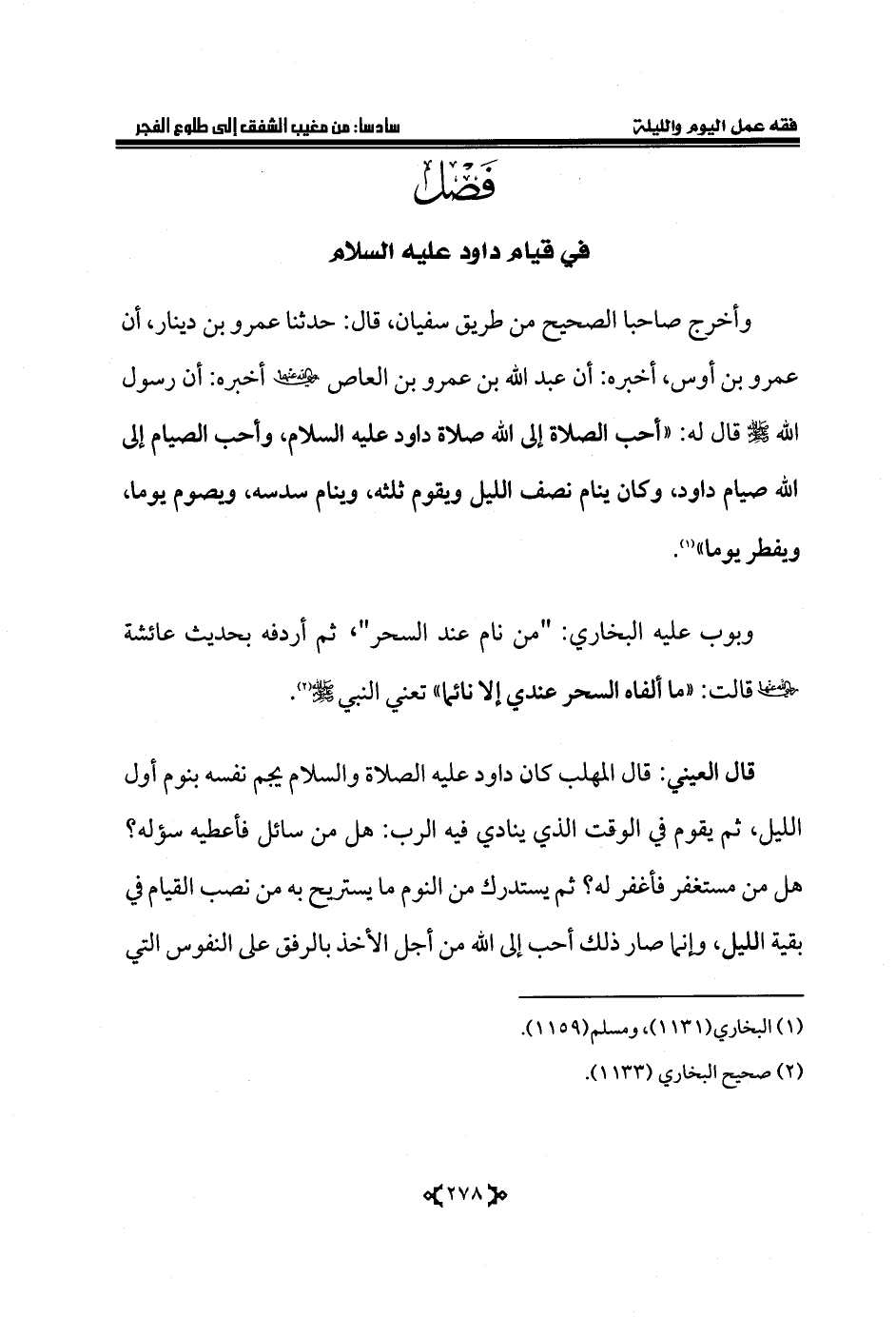 وأخرج صاحبا الصحيح من طريق سفيان، قال: حدثنا عمرو بن دينار، أن عمرو بن أوس، أخبره: أن عبد الله بن عمرو بن العاص - رضي الله عنهما - أخبره: أن رسول الله - صلى الله عليه وسلم - قال له: «أحب الصلاة إلى الله صلاة داود عليه السلام، وأحب الصيام إلى الله صيام داود، وكان ينام نصف الليل ويقوم ثلثه، وينام سدسه، ويصوم يوما، ويفطر يوما» (¬1).