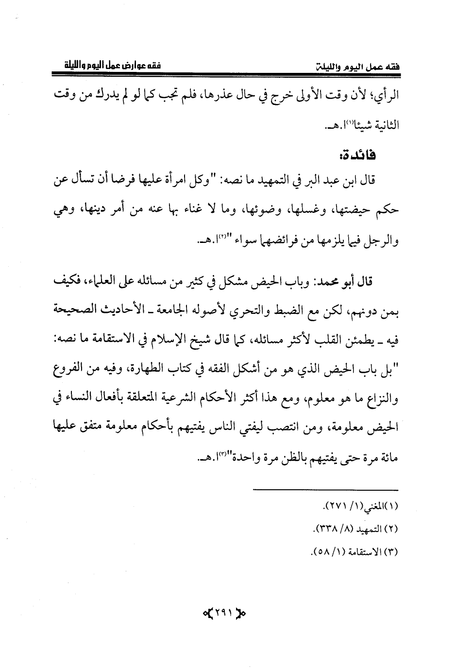 قال ابن عبد البر في التمهيد ما نصه: "وكل امرأة عليها فرضا أن تسأل عن حكم حيضتها، وغسلها، وضوئها، وما لا غناء بها عنه من أمر دينها، وهي والرجل فيما يلزمها من فرائضهما سواء " (¬2) ا. هـ.