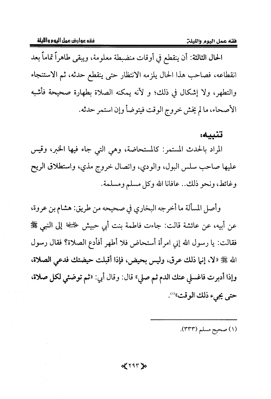 وأصل المسألة ما أخرجه البخاري في صحيحه من طريق: هشام بن عروة، عن أبيه، عن عائشة قالت: جاءت فاطمة بنت أبي حبيش - رضي الله عنها - إلى النبي - صلى الله عليه وسلم - فقالت: يا رسول الله إني امرأة أستحاض فلا أطهر أفأدع الصلاة؟ فقال رسول الله - صلى الله عليه وسلم - «لا، إنما ذلك عرق، وليس بحيض، فإذا أقبلت حيضتك فدعي الصلاة، وإذا أدبرت فاغسلي عنك الدم ثم صلي» قال: وقال أبي: «ثم توضئي لكل صلاة، حتى يجيء ذلك الوقت» (¬1).