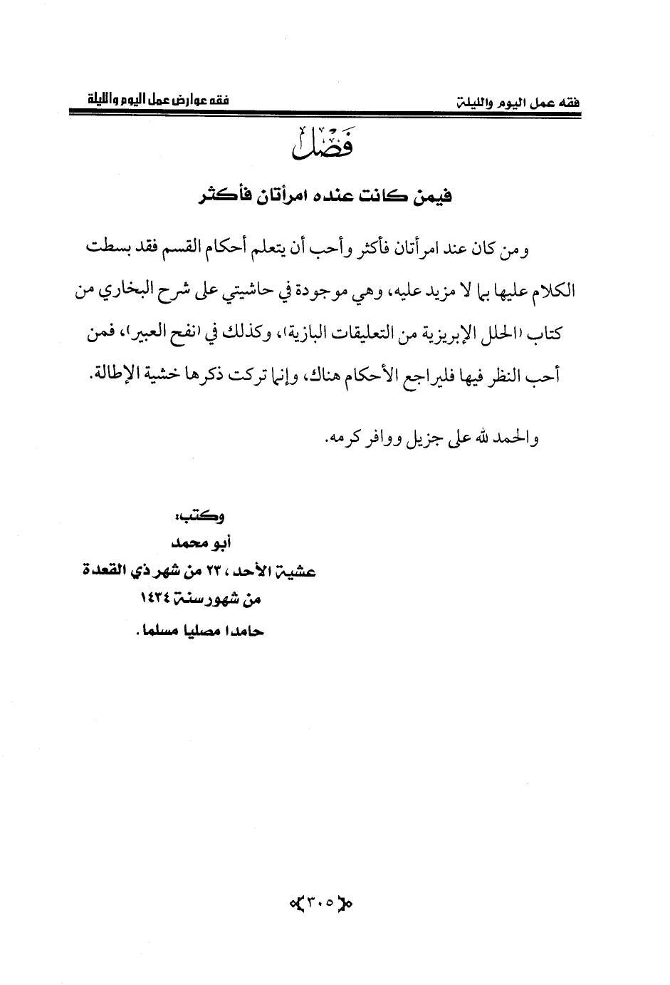 ومن كان عند امرأتان فأكثر وأحب أن يتعلم أحكام القسم فقد بسطت الكلام عليها بما لا مزيد عليه، وهي موجودة في حاشيتي على شرح البخاري من كتاب «الحلل الإبريزية من التعليقات البازية»، وكذلك في «نفح العبير»، فمن أحب النظر فيها فليراجع الأحكام هناك، وإنما تركت ذكرها خشية الإطالة.