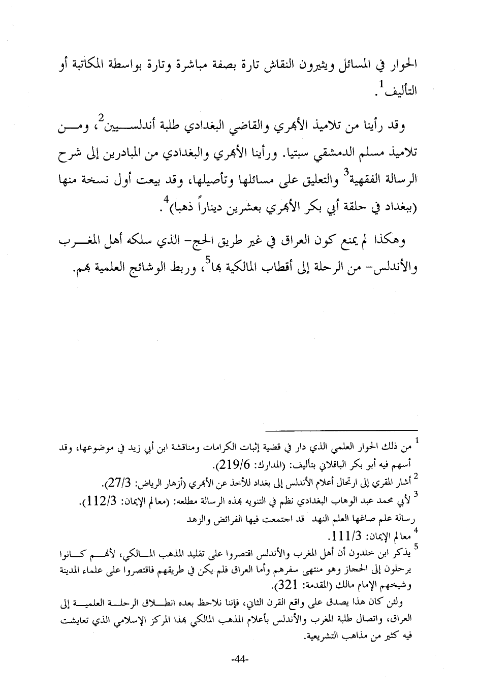 وهكذا لم يمنع كون العراق في غير طريق الحج -الذي سلكه أهل المغرب والأندلس- من الرحلة إلى أقطاب المالكية بها (٥)، وربط الوشائج العلمية بهم.