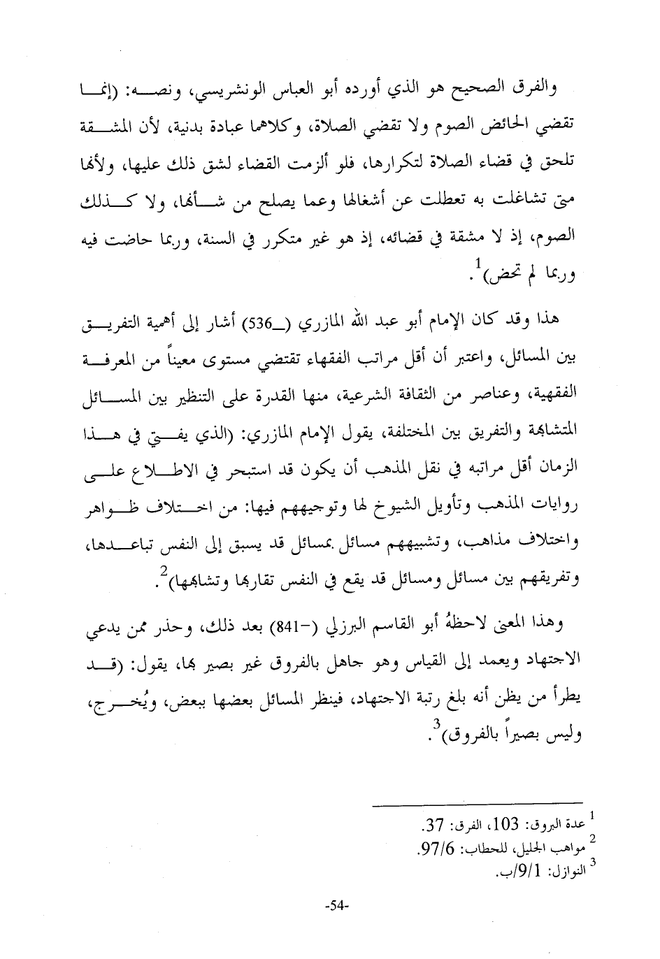 هذا وقد كان الإمام أبو عبد الله المازري (-٥٣٦) أشار إفى أهمية التفريق بين المسائل، واعتبر أن أقل مراتب الفقهاء تقتضي مستوى معينًا من المعرفة الفقهية، وعناصر من الثقافة الشرعية، منها القدرة على التنظير بين المسائل المتشابهة والتفريق بين المختلفة، يقول الإمام المازري: (الذي يفتي في هذا الزمان أقل مراتبه في نقل المذهب أن يكون قد استبحر في الاطلاع على روايات المذهب وتأويل الشيوخ لها وتوجيههم فيها: من اختلاف ظواهر واختلاف مذاهب، وتشبيههم مسائل بمسائل قد يسبق إلى النفس تباعدها، وتفريقهم بين مسائل ومسائل قد يقع في النفس تقاربها وتشابهها) (٢).
