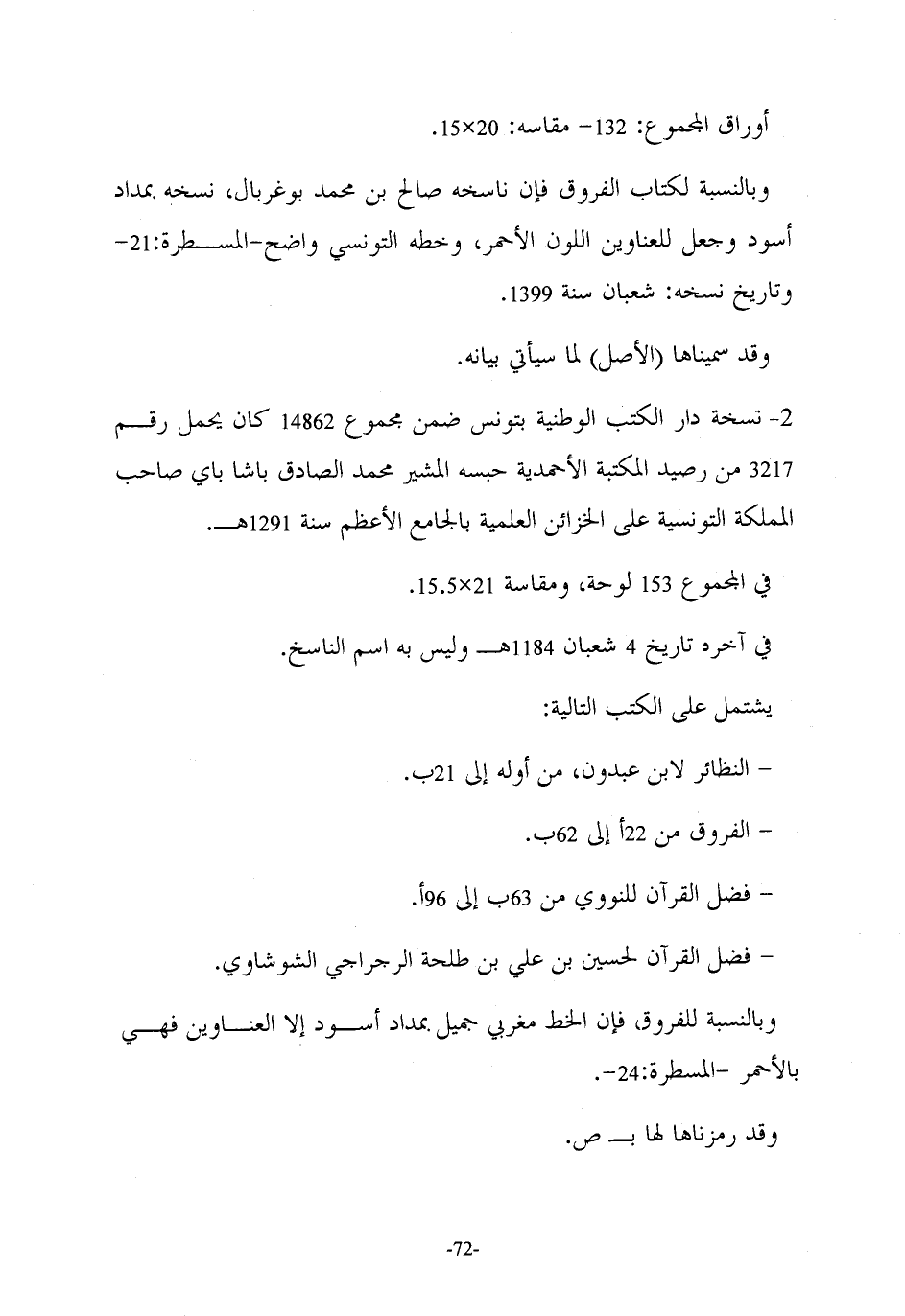 ٢ - نسخة دار الكتب الوطنية بتونس ضمن مجموع ١٤٨٦٢ كان يحمل رقم ٣٢١٧ من رصيد المكتبة الأحمدية حبسه المشير محمد الصادق باشا باي صاحب المملكة التونسية على الخزائن العلمية بالجامع الأعظم سنة ١٢٩١ هـ ـ.