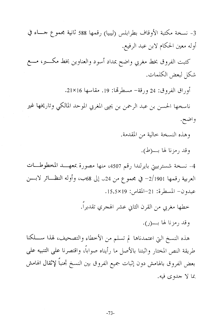 ٤ - نسخة شستربيتي بايرلندا رقم ٤٥٠٧، منها مصورة بمعهد المخطوطات العربية رقمها ٢/ ١٩٠١ - في مجموع من ٢٤ ب إلى ٦٨ ب، وأوله النظائر لابن عبدون - المسطر: : ٢١ - المقاس: ١٩ × ١٥.٥.