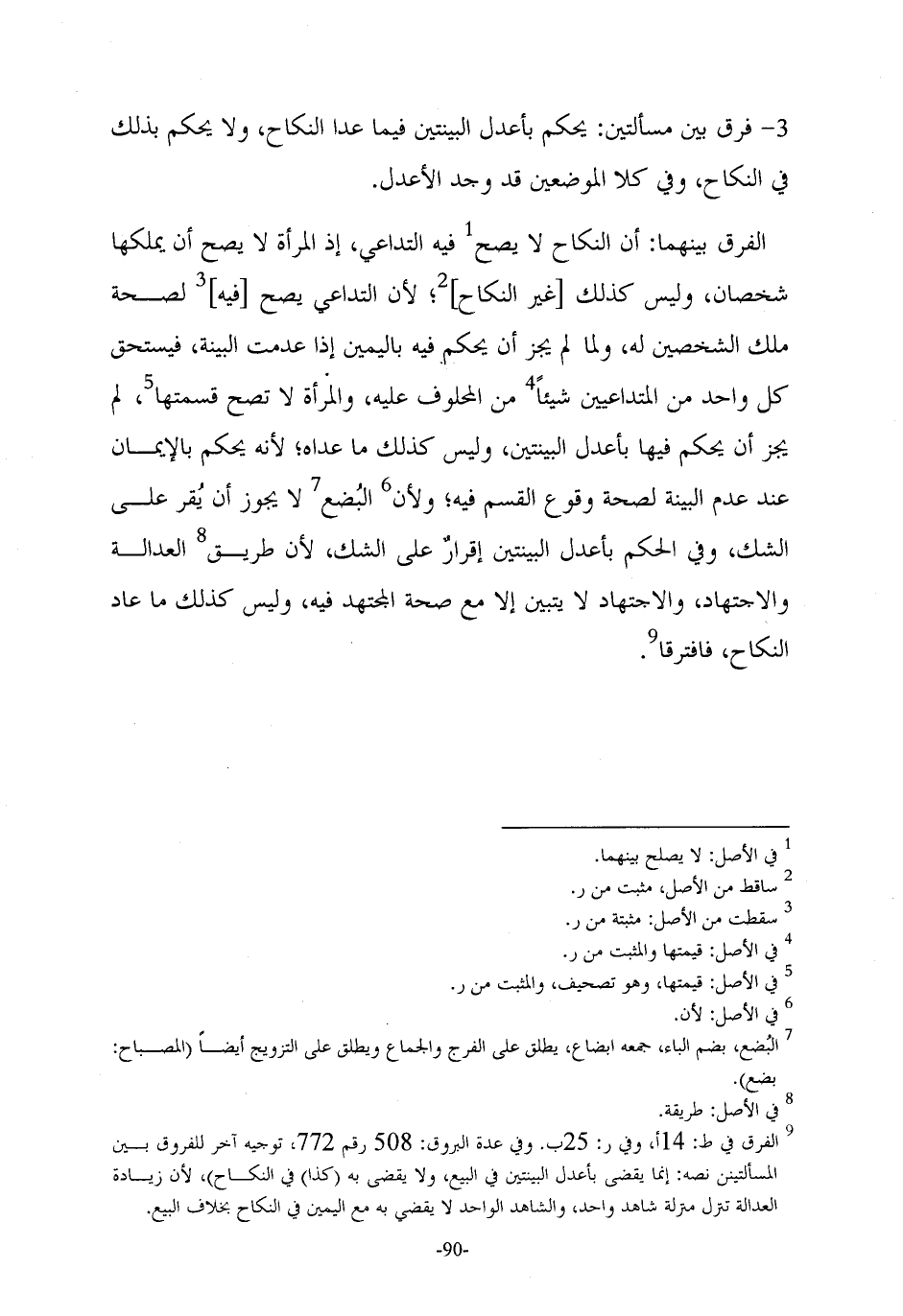 (٩) الفرق في ط: ١٤ أ، وفي ر: ٢٥ ب. وفي عدة البروق: ٥٠٨ رقم ٧٧٢، توجيه آخر للفروق بين المسألتين نصه: إنما يقضى بأعدل البينتين في البيع، ولا يقضى به (كذا) في النكاح)، لأن زيادة العدالة تنزل منزلة شاهد واحد، والشاهد الواحد لا يقضي به مع اليمين في النكاح بخلاف البيع.