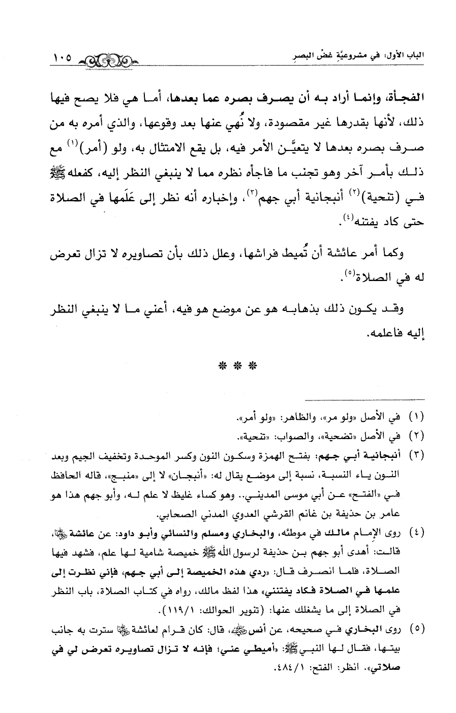 (¬4) روى الإِمام مالك في موطئه، والبخاري ومسلم والنسائي وأبو داود: عن عائشة - رضي الله عنها -، قالت: أهدى أبو جهم بن حذيفة لرسول الله - صلى الله عليه وسلم - خميصة شامية لها علم، فشهد فيها الصلاة، فلما انصرف قال: "ردي هذه الخميصة إلى أبي جهم، فإني نظرت إلى علمها في الصلاة فكاد يفتنني" هذا لفظ مالك، رواه في كتاب الصلاة، باب النظر في الصلاة إلى ما يشغلك عنها: (تنوير الحوالك: 1/ 119).