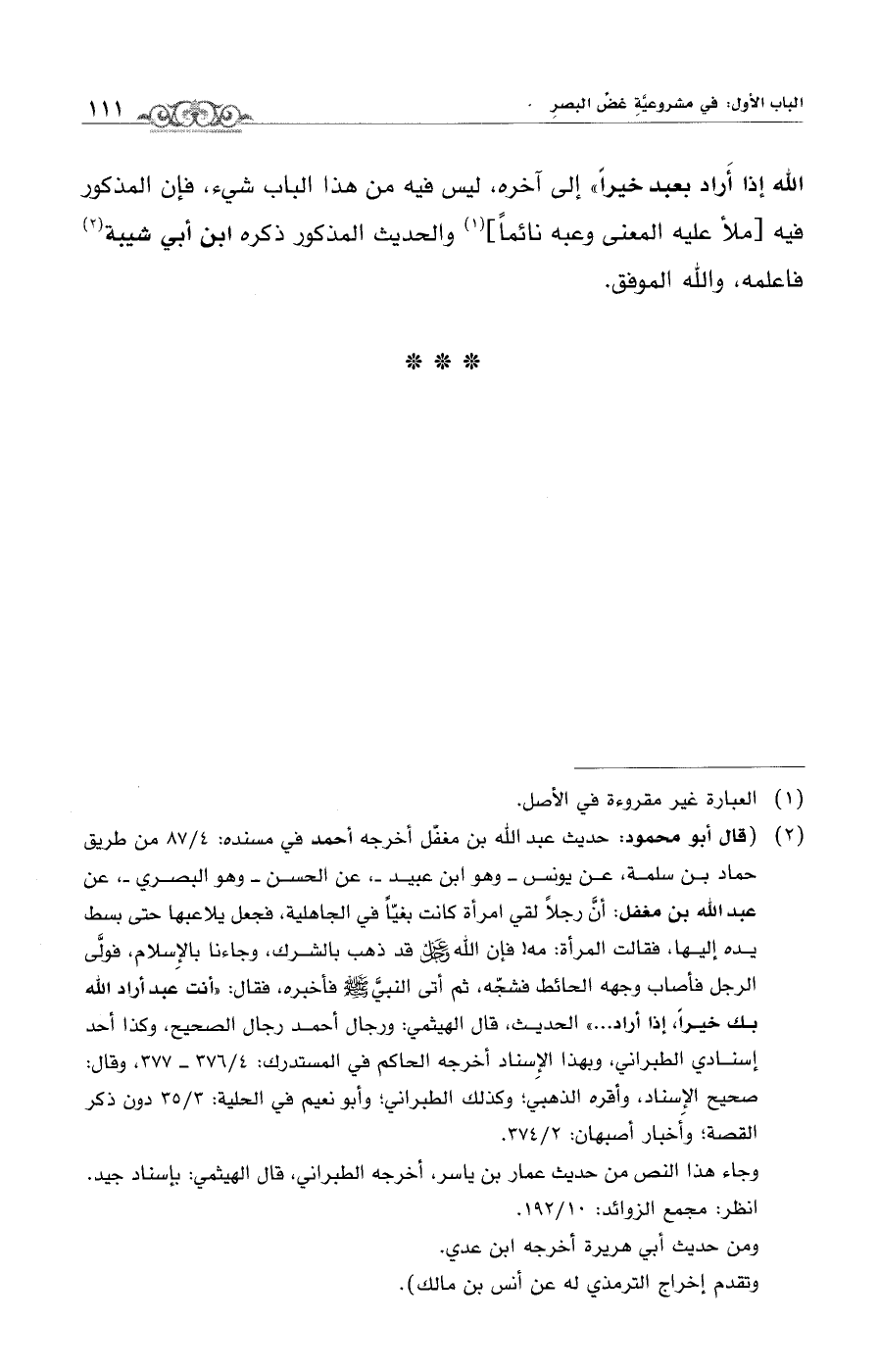 (¬2) (قال أبو محمود: حديث عبد الله بن مغفل أخرجه أحمد في مسنده: 4/ 87 من طريق حماد بن سلمة، عن يونس -وهو ابن عبيد-، عن الحسن -وهو البصري-، عن عبد الله بن مغفل: أنَّ رجلًا لقي امرأة كانت بغيّاً في الجاهلية، فجعل يلاعبها حتى بسط يده إليها، فقالت المرأة: مه! فإن الله -عَزَّ وَجَلَّ- قد ذهب بالشرك، وجاءنا بالإِسلام، فولَّى الرجل فأصاب وجهه الحائط فشجّه، ثم أتى النبيَّ - صلى الله عليه وسلم - فأخبره، فقال: "أنت عبد أراد الله بك خيراً، إذا أراد .. ." الحديث، قال الهيثمي: ورجال أحمد رجال الصحيح، وكذا أحد إسنادي الطبراني، وبهذا الإِسناد أخرجه الحاكم في المستدرك: 4/ 376 - 377، وقال: صحيح الإسناد، وأقره الذهبي؛ وكذلك الطبراني؛ وأبو نعيم في الحلية: 3/ 35 دون ذكر القصة؛ وَأخبار أصبهان: 2/ 374.