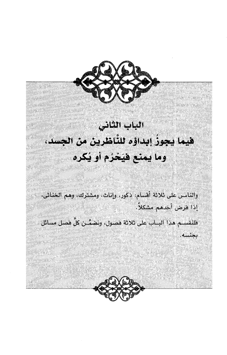 فلنقسم هذا الباب على ثلاثة فصول، ونضمن كلَّ فصل مسائل بجنسه.