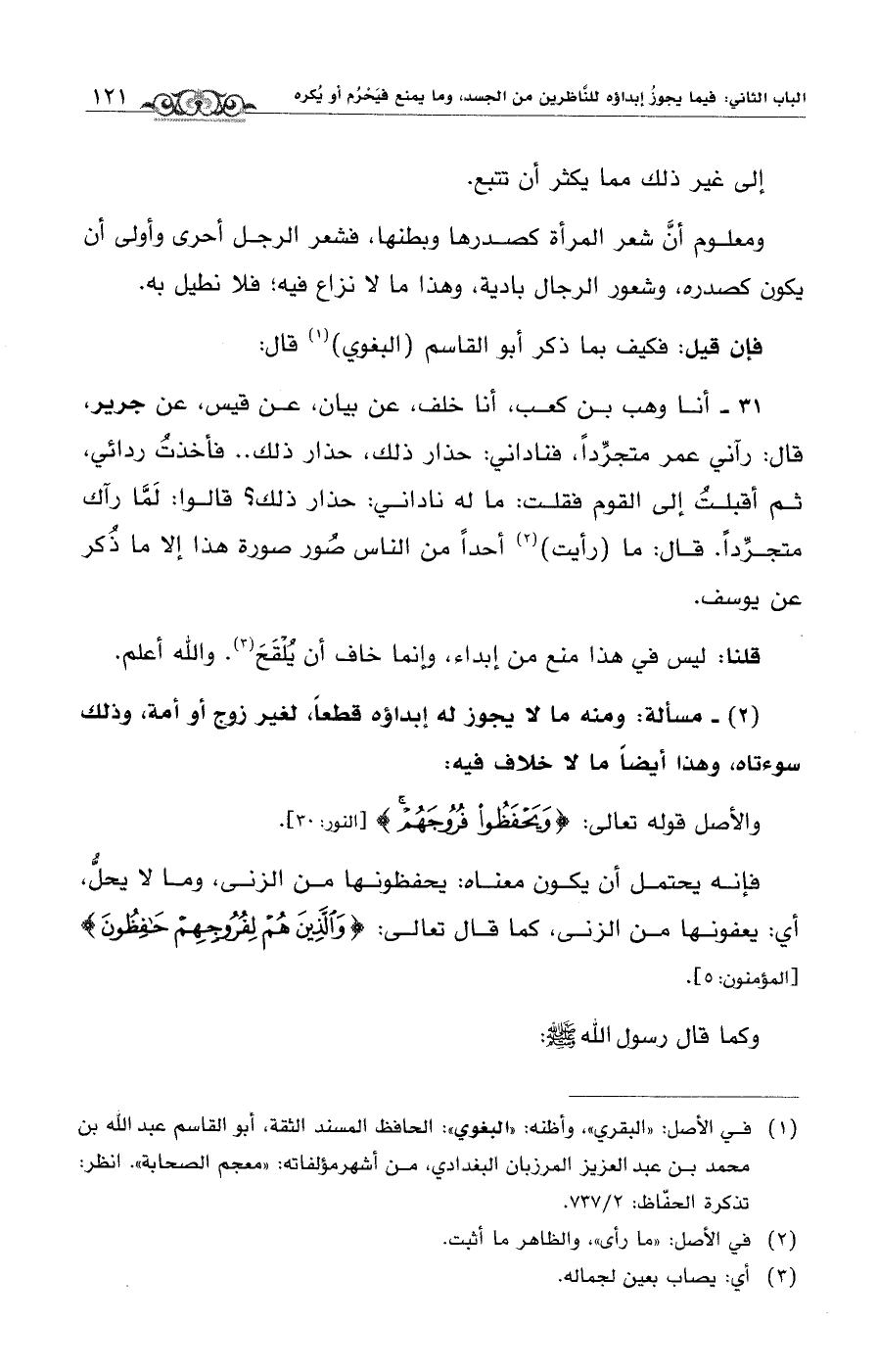 ومعلوم أنَّ شعر المرأة كصدرها وبطنها، فشعر الرجل أحرى وأولى أن يكون كصدره، وشعور الرجال بادية، وهذا ما لا نزاع فيه؛ فلا نطيل به.