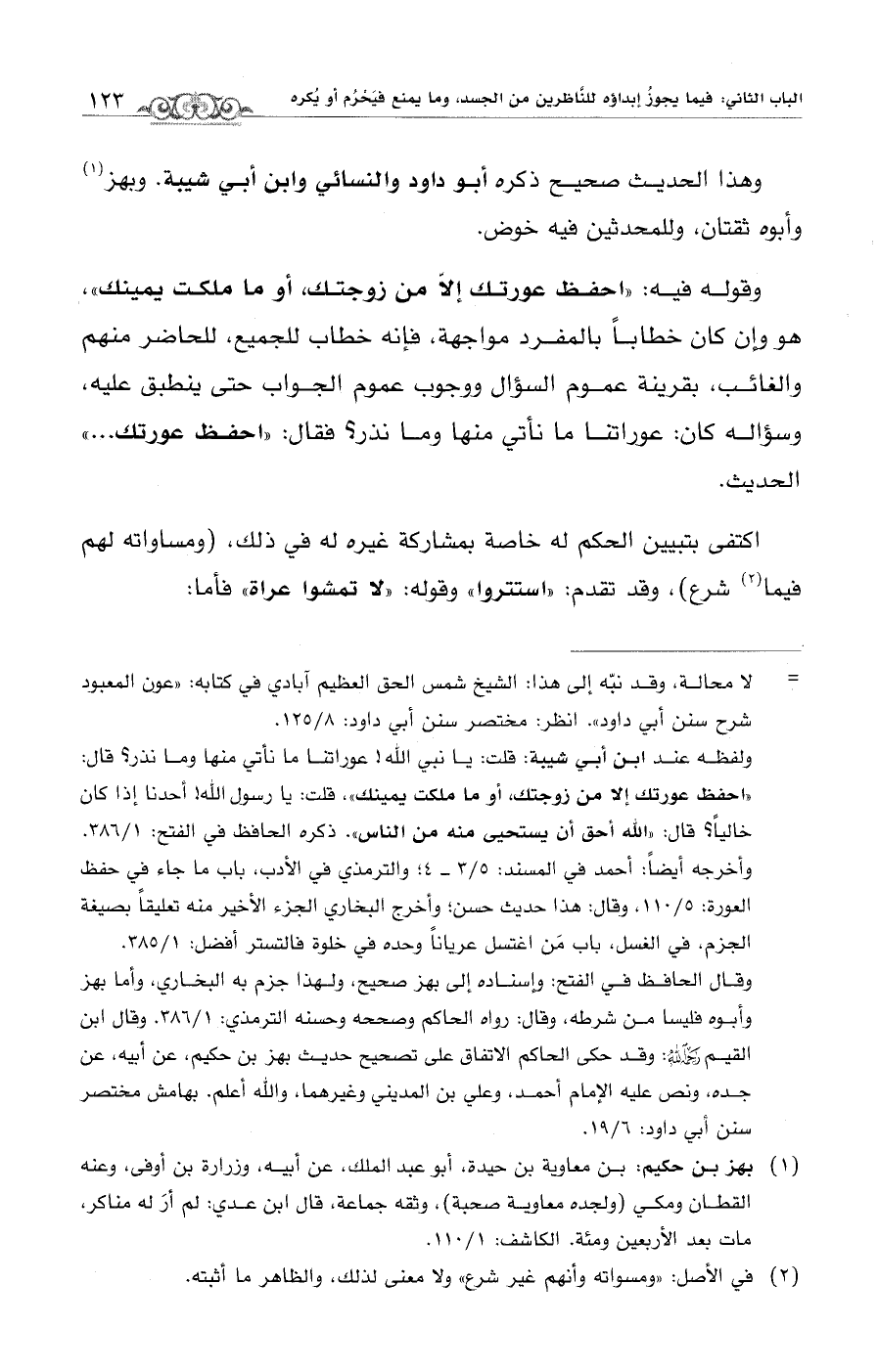ولفظه عند ابن أبي شيبة: قلت: يا نبي الله! عوراتنا ما نأتي منها وما نذر؟ قال: "احفظ عورتك إلا من زوجتك، أو ما ملكلت يمينك"، قلت: يا رسول الله! أحدنا إذا كان خاليًا؟ قال: "الله أحق أن يستحيى منه من الناس". ذكره الحافظ في الفتح: 1/ 386. وأخرجه أيضًا: أحمد في المسند: 5/ 3 - 4؛ والترمذي في الأدب، باب ما جاء في حفظ العورة: 5/ 110، وقال: هذا حديث حسن؛ وأخرج البخاري الجزء الأخير منه تعليقاً بصيغة الجزم، في الغسل، باب مَن اغتسل عرياناً وحده في خلوة فالتستر أفضل: 1/ 385. وقال الحافظ في الفتح: وإسناده إلى بهز صحيح، ولهذا جزم به البخاري، وأما بهز وأبوه فليسا من شرطه، وقال: رواه الحاكم وصححه وحسنه الترمذي: 1/ 386. وقال ابن القيِّم -رَحِمَهُ اللهُ-: وقد حكى الحاكم الإتفاق على تصحيح حديث بهز بن حكيم، عن أبيه، عن جده، ونص عليه الإمام أحمد، وعلي بن المديني وغيرهما، والله أعلم. بهامش مختصر سنن أبي داود: 6/ 19.