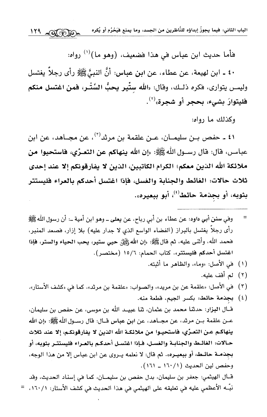 41 - حفص بن سليمان، عن علقمة بن مرثد (¬3)، عن مجاهد، عن ابن عباس، قال: قال رسول الله - صلى الله عليه وسلم -: "إن الله ينهاكم عن التعري، فاستحيوا من ملائكة الله الذين معكم؛ الكرام الكاتبين، الذين لا يفارقونكم إلا عند إحدى ثلاث حالات: الغائط والجنابة والغسل، فإذا اغتسل أحدكم بالعراء فليستتر بثوبه، أو بجِذمة حائط (¬4)، أبو ببعيره".