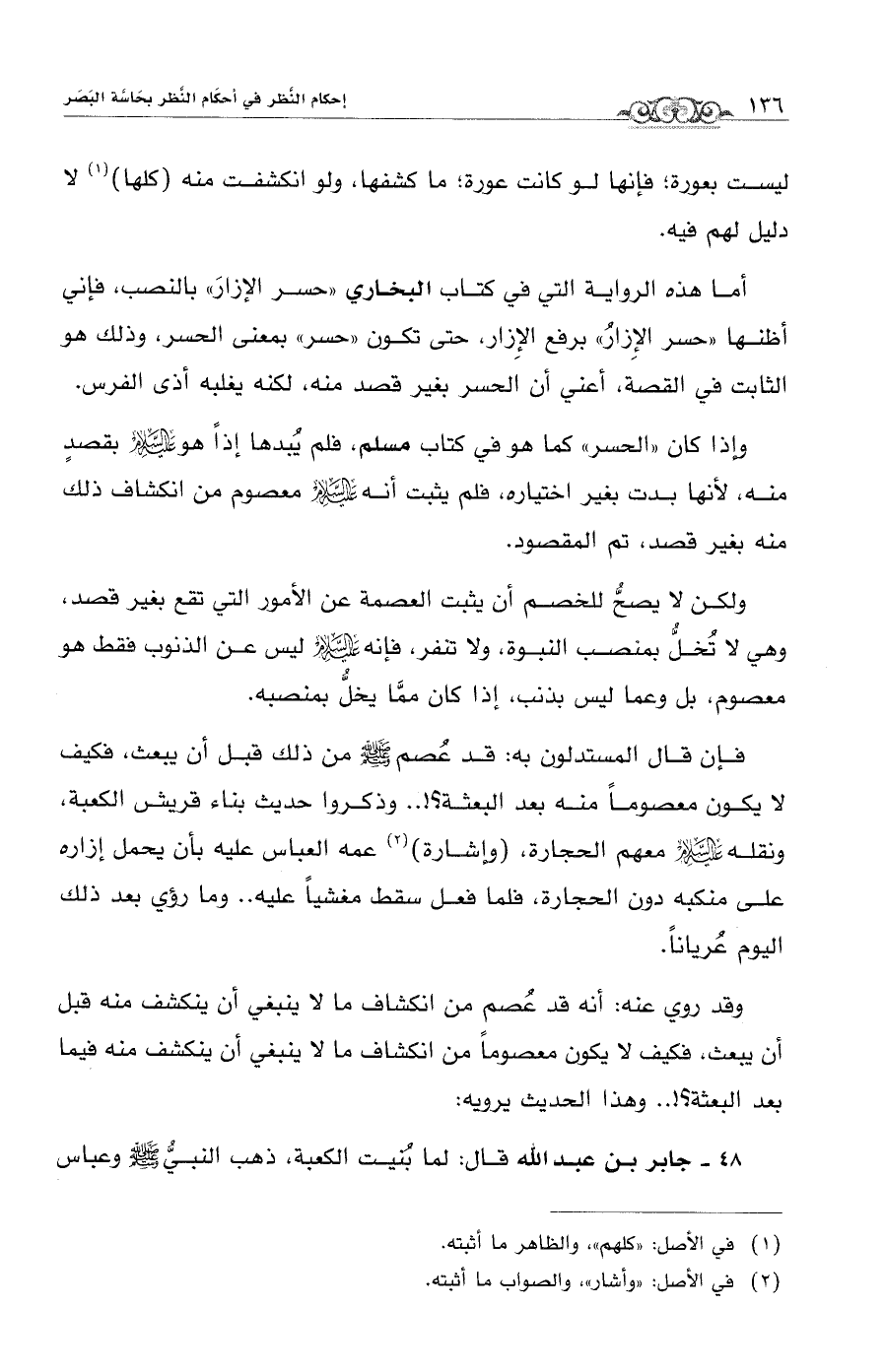 وإذا كان "الحسر" كما هو في كتاب مسلم، فلمُ يبدها إذًا هو -عَلَيْهِ السَّلَامْ- بقصدٍ منه، لأنها بدت بغير اختياره، فلم يثبت أنه -عَلَيْهِ السَّلَامْ- معصوم من انكشاف ذلك منه بغير قصد، تم المقصود.