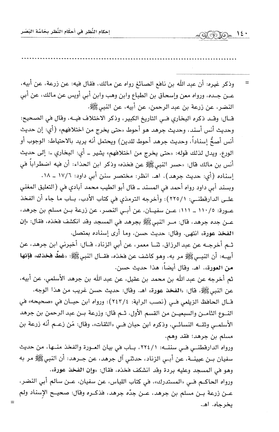قال: وقد ذكره البخاري في التاريخ الكبير، وذكر الإختلاف فيه، وقال في الصحيح: وحديث أنس أسند، وحديث جرهد هو أحوط "حتى يخرج من اختلافهم" (أي: إن حديث أنس أصحُّ إسناداً، وحديث جرهد أحوط للدين) ويحتمل أنه يريد بالإحتياط: الوجوب أو الورع، ويدل لذلك قوله: "حتى يخرج من اختلافهم" يشير -أي: البخاري-: إلى حديث أنس بن مالك قال: "حسر النبي - صلى الله عليه وسلم - عن فخذه" وذكر ابن الحذاء: أن فيه اضطراباً في إسناده (أي: حديث جرهد). اهـ. انظر: مختصر سنن أبي داود: 6/ 17 - 18. وبسند أبي داود رواه أحمد في المسند - قال أبو الطَّيِّب محمد آبادي في (التعليق المغني على الدارقطني: 1/ 225): وأخرجه الترمذي في كتاب الأدب، باب ما جاء أن الفخذ عورة: 5/ 110 - 111: عن سفيان، عن أبي النصر، عن زرعة بن مسلم بن جرهد، عن جده جرهد، قال: مر النبي - صلى الله عليه وسلم - بجرهد في المسجد وقد انكشف فخذه، فقال: "إن الفخذ عورة" انتهى. وقال: حديث حسن، وما أرى إسناده بمتصل.