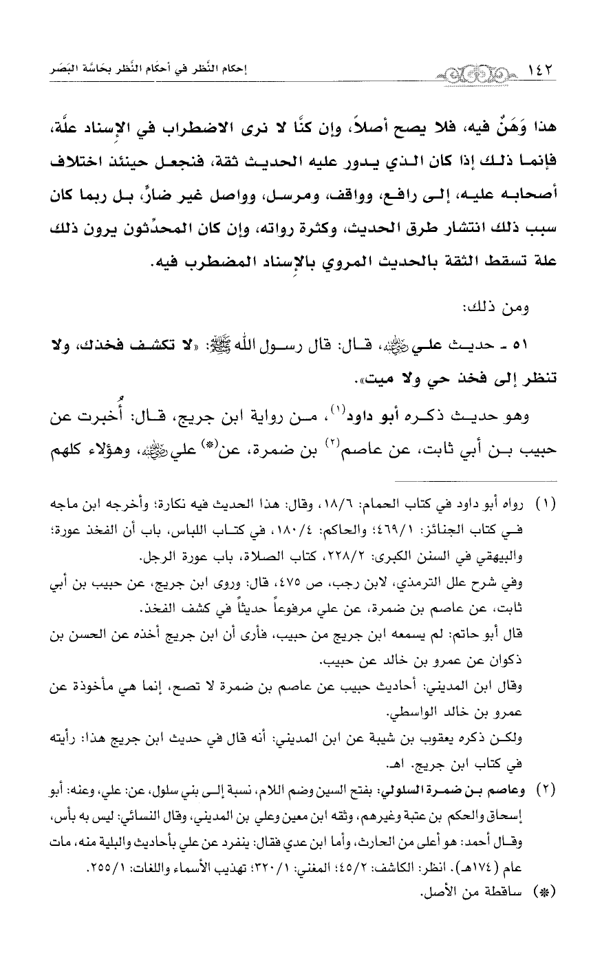 وفي شرح علل الترمذي، لابن رجب، ص: 475، قال: وروى ابن جريج، عن حبيب ابن أبي ثابت، عن عاصم بن ضمرة، عن علي مرفوعًا حديثاً في كشف الفخذ.