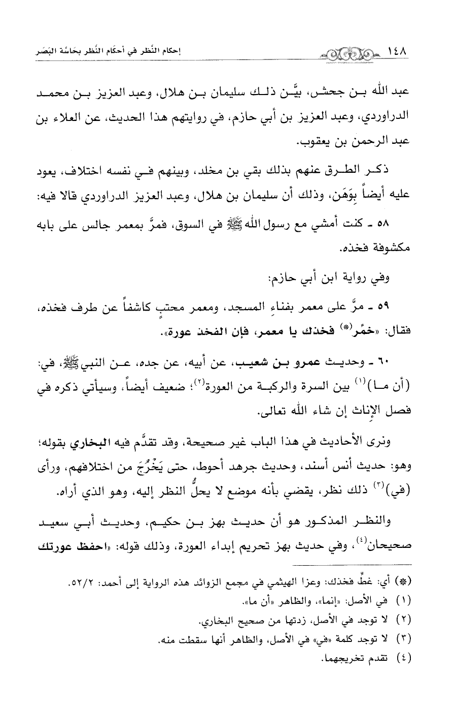 (*) أي: غطِّ فخذك: وعزا الهيثمي في مجمع الزوائد هذه الرواية إلى أحمد: 2/ 52.