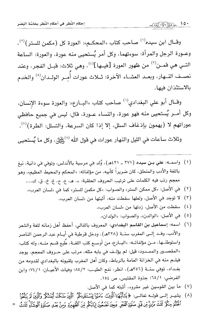 (¬8) يشير إلى قوله تعالى: {يَاأَيُّهَا الَّذِينَ آمَنُوا لِيَسْتَأْذِنْكُمُ الَّذِينَ مَلَكَتْ أَيْمَانُكُمْ وَالَّذِينَ لَمْ يَبْلُغُوا الْحُلُمَ مِنْكُمْ ثَلَاثَ مَرَّاتٍ مِنْ قَبْلِ صَلَاةِ الْفَجْرِ وَحِينَ تَضَعُونَ ثِيَابَكُمْ مِنَ الظَّهِيرَةِ وَمِنْ بَعْدِ صَلَاةِ الْعِشَاءِ ثَلَاثُ =