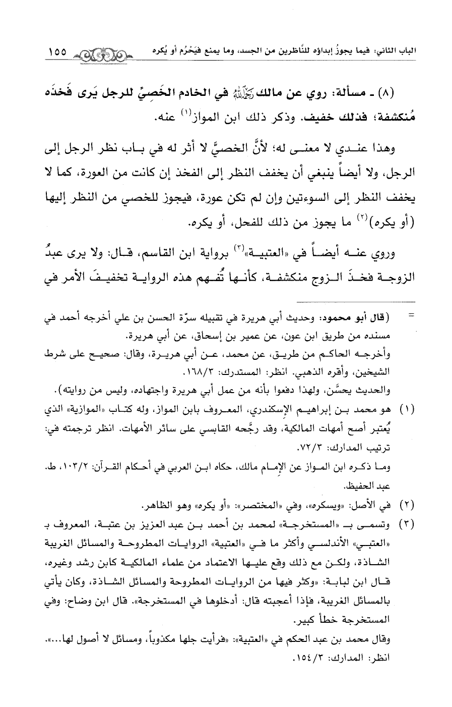 (8) - مسألة: روي عن مالك -رَحِمَهُ اللهُ- في الخادم الخَصِيِّ للرجل يَرى فَخذَه مُنكشفة؛ فدلك خفيف. وذكر ذلك ابن المواز (¬1) عنه.