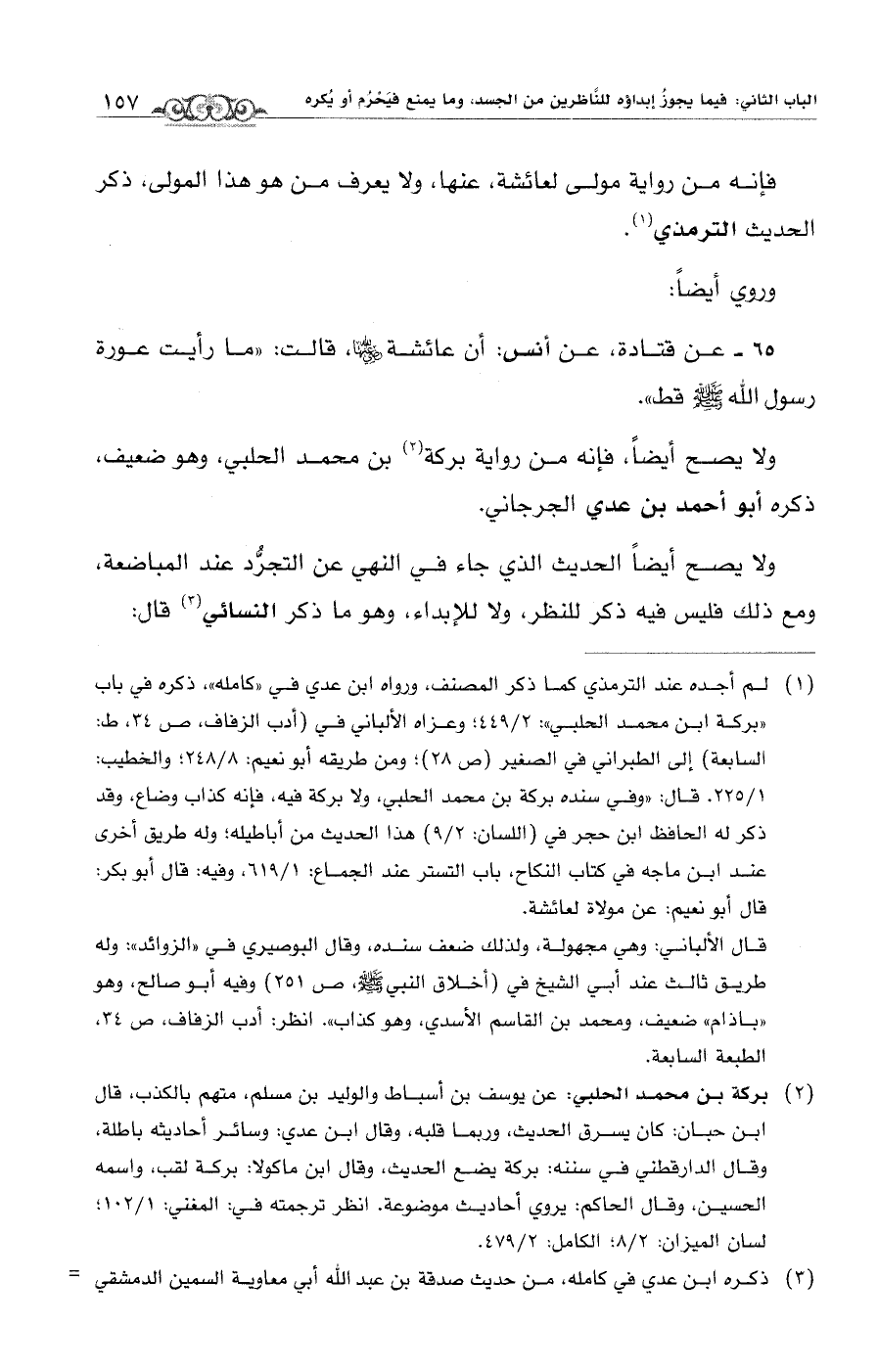 ولا يصح أيضًا الحديث الذي جاء في النهي عن التجرُّد عند المباضعة، ومع ذلك فليس فيه ذكر للنظر، ولا للإبداء، وهو ما ذكر النسائي (¬3) قال: