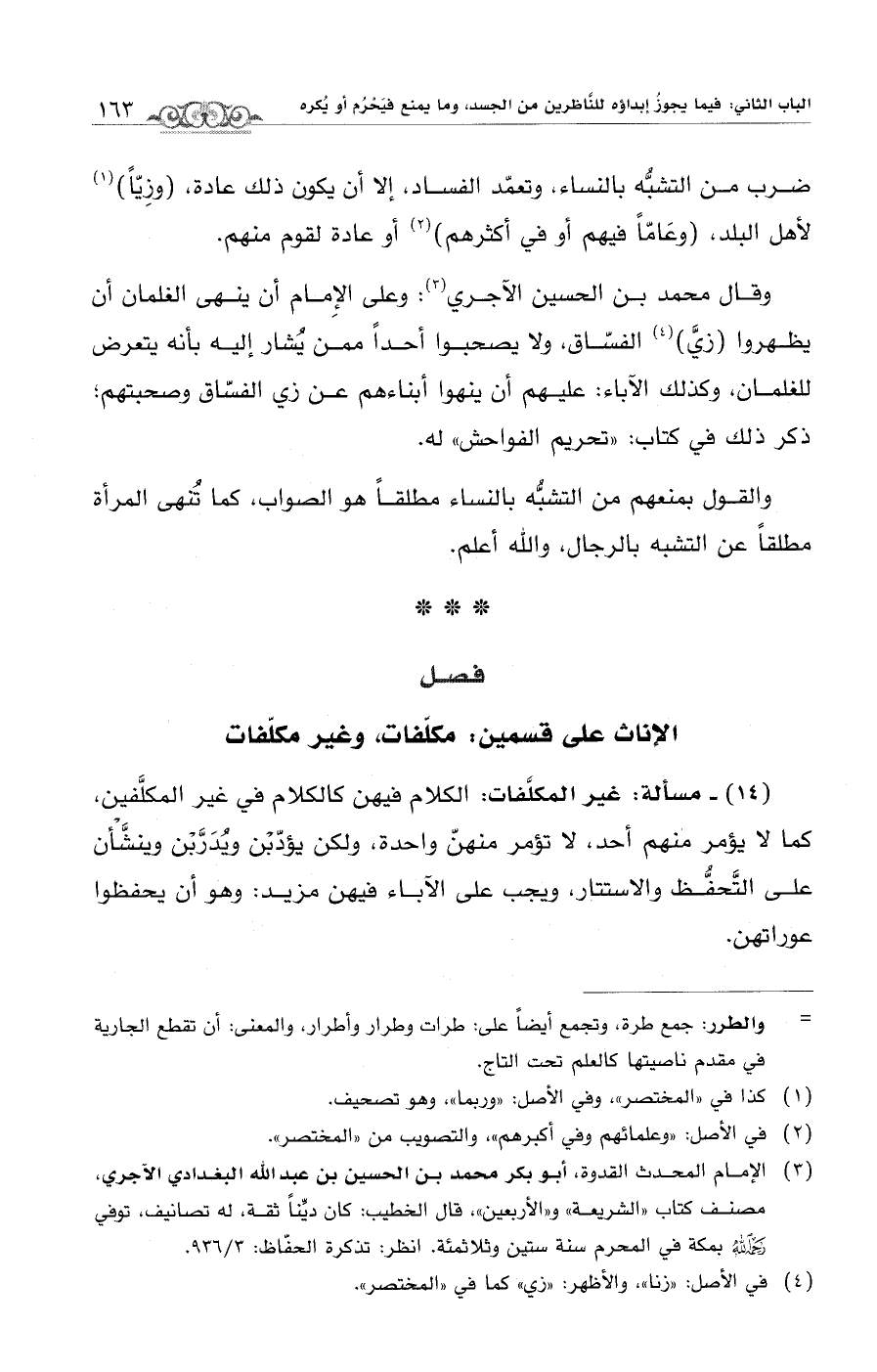 وقال محمد بن الحسين الآجري (¬3): وعلى الإِمام أن ينهى الغلمان أن يظهروا (زيَّ) (¬4) الفسّاق، ولا يصحبوا أحدًا ممن يُشار إليه بأنه يتعرض للغلمان، وكذلك الآباء: عليهم أن ينهوا أبناءهم عن زي الفسّاق وصحبتهم؛ ذكر ذلك في كتاب: "تحريم الفواحش" له.