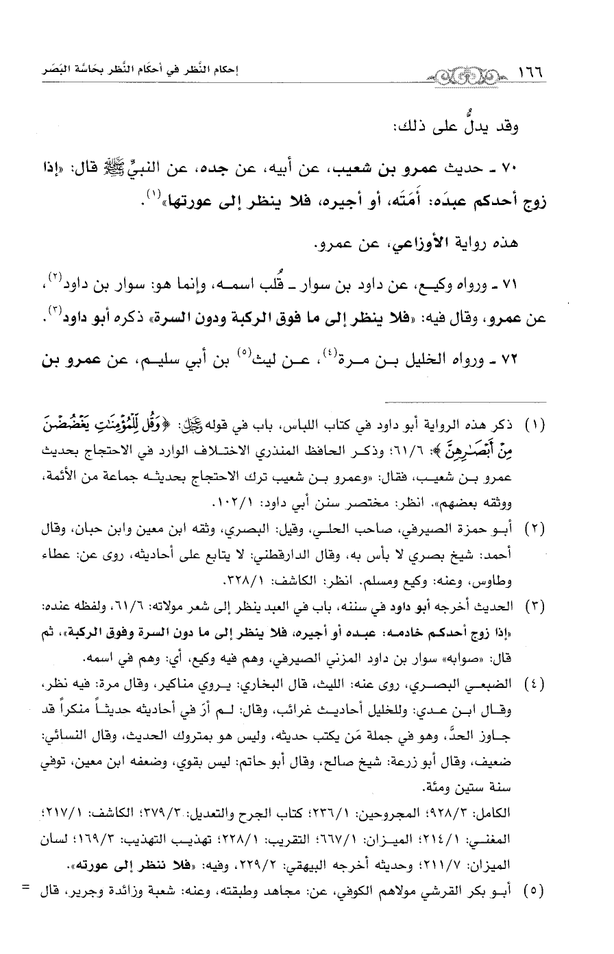 (¬1) ذكر هذه الرواية أبو داود في كتاب اللباس، باب في قوله -عَزَّ وَجَلَّ-: {وَقُلْ لِلْمُؤْمِنَاتِ يَغْضُضْنَ مِنْ أَبْصَارِهِنَّ}: 6/ 61؛ وذكر الحافظ المنذري الإختلاف الوارد في الإحتجاج بحديث عمرو بن شعيب، فقال: "وعمرو بن شعيب ترك الإحتجاج بحديثه جماعة من الأئمة، ووثقه بعضهم". انظر: مختصر سنن أبي داود: 1/ 102.