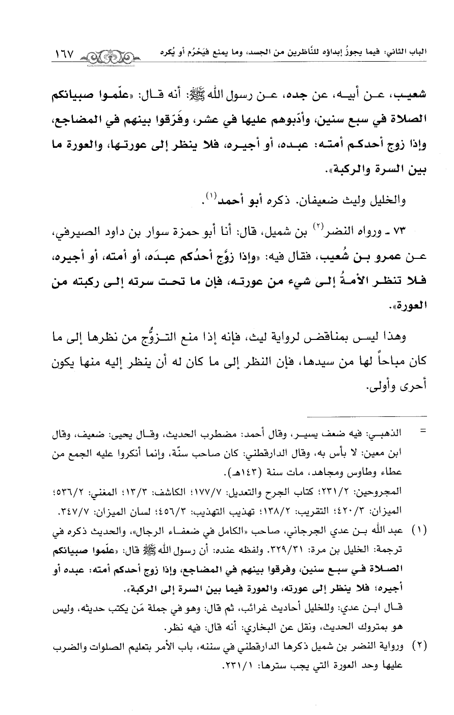 (¬1) عبد الله بن عدي الجرجاني، صاحب "الكامل في ضعفاء الرجال"، والحديث ذكره في ترجمة: الخليل بن مرة: 31/ 329. ولفظه عنده: أن رسول الله - صلى الله عليه وسلم - قال: "علّموا صبيانكم الصلاة في سبع سنين، وفرقوا بينهم في المضاجع، واذا زوج أحدكم أمته: عبده أو أجيره. فلا ينطر إلى عورته، والعورة فيما بين السرة إلى الركبة".
