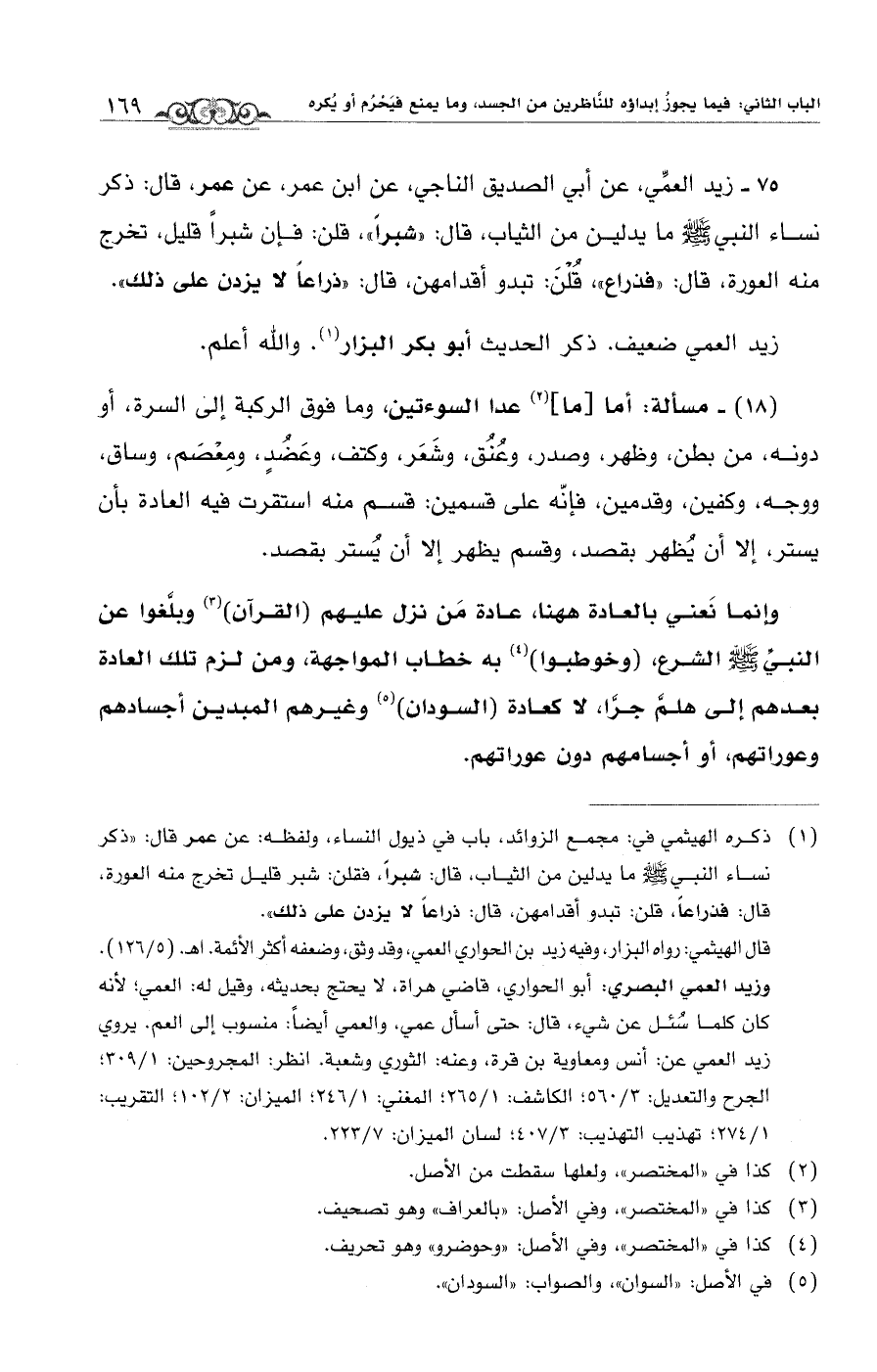 75 - زيد العمِّي، عن أبي الصديق الناجي، عن ابن عمر، عن عمر، قال: ذكر نساء النبي - صلى الله عليه وسلم - ما يدلين من الثياب، قال: "شبرًا"، قلن: فإن شبرًا قليل، تخرج منه العورة، قال: "فذراع" قُلْنَ: تبدو أقدامهن، قال:، ذراعًا لا يزدن على ذلك".