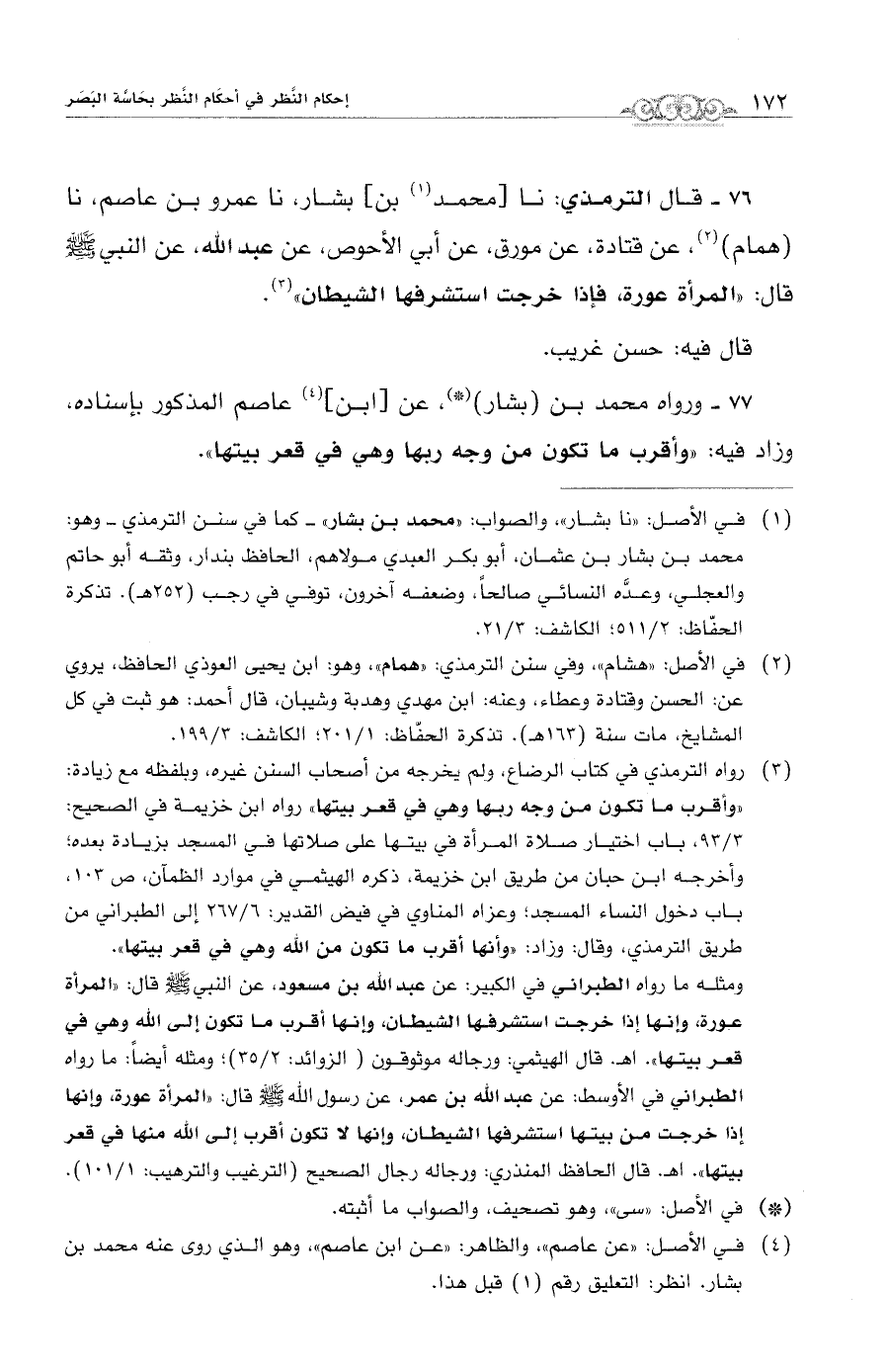 76 - قال الترمذي: نا [محمد (¬1) بن] بشار، نا عمرو بن عاصم، نا (همام) (¬2)، عن قتادة، عن مورق، عن أبي الأحوص، عن عبد الله، عن النبي - صلى الله عليه وسلم - قال: "المرأة عورة، فإذا خرجت استشرفها الشيطان" (¬3).