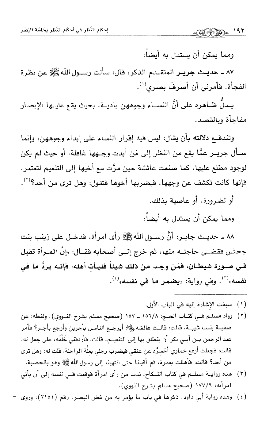 وتندفع دلالته بأن يقال: ليس فيه إقرار النساء على إبداء وجوههن، وإنما سأل جرير عمَّا يقع من النظر إلى مَن أبدت وجهها غافلة، أو حيث لم يكن لوجود مطلع عليها، كما صنعت عائشة حين مرَّت مع أخيها إلى التنعيم لتعتمر، فإنها كانت تكشف عن وجهها، فيضربها أخوها فتقول: وهل ترى من أحد؟ (¬2).