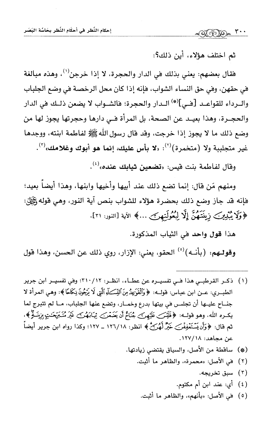(¬1) ذكر القرطبي هذا في تفسيره عن عطاء، انظر: 12/ 310: وفي تفسير ابن جرير الطبري: عن ابن عباس: قوله: {وَالْقَوَاعِدُ مِنَ النِّسَاءِ اللَّاتِي لَا يَرْجُونَ نِكَاحًا}: وهي المرأة لا جناح عليها أن تجلس في بيتها بدرع وخمار، وتضع عنها الجلباب، ما لم تتبرج لما يكره الله، وهو قوله: {فَلَيْسَ عَلَيْهِنَّ جُنَاحٌ أَنْ يَضَعْنَ ثِيَابَهُنَّ غَيْرَ مُتَبَرِّجَاتٍ بِزِينَةٍ}. ثم قال {وَأَنْ يَسْتَعْفِفْنَ خَيْرٌ لَهُنَّ} انظر: 18/ 136 - 137؛ وكذا رواه ابن جرير أيضًا عن مجاهد: 18/ 137.