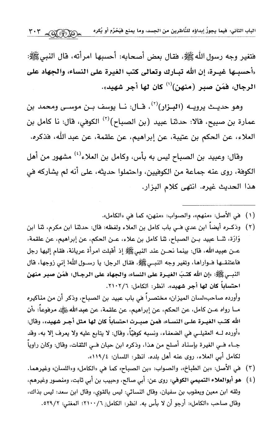 (¬2) وذكره أيضًا ابن عدي في باب كلامل بن العلاء ولفظه: قال: حدثنا ابن مكرم، ثنا ابن وَارَة، ثنا عبيد بن الصباح، ثنا كامل بن علاء، عن الحكم، عن إبراهيم، عن علقمة، عن عبيد الله، قال: بينما نحن عند النبي - صلى الله عليه وسلم - إذ أقبلت امرأة عريانة، فقام إليها رجل فاعتنقها فواراها، وتغير وجه النبي - صلى الله عليه وسلم -، فقال الرجل: يا رسول الله! إني زوجها، قال النبي - صلى الله عليه وسلم -: "إن الله كتبَ الغيرة على النساء، والجهاد على الرجال، فمَن صبر منهن احتسابًا كان لها أجر شهيد". انظر: الكامل: 6/ 2102.